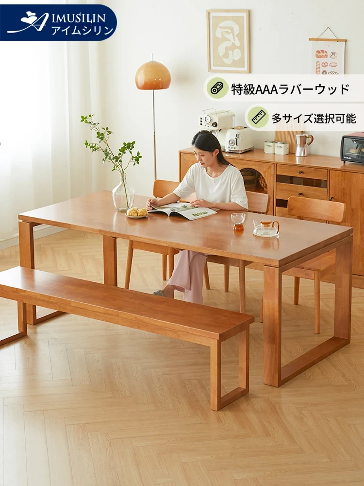モビエン製の無垢材ダイニングテーブル|家族団らんに最適な四角形テーブル|書道や食事にぴったりなリビング用ロングデスク|スタイリッシュなデザインでおしゃれな空間を演出!