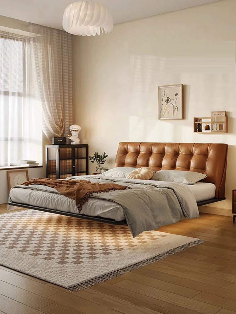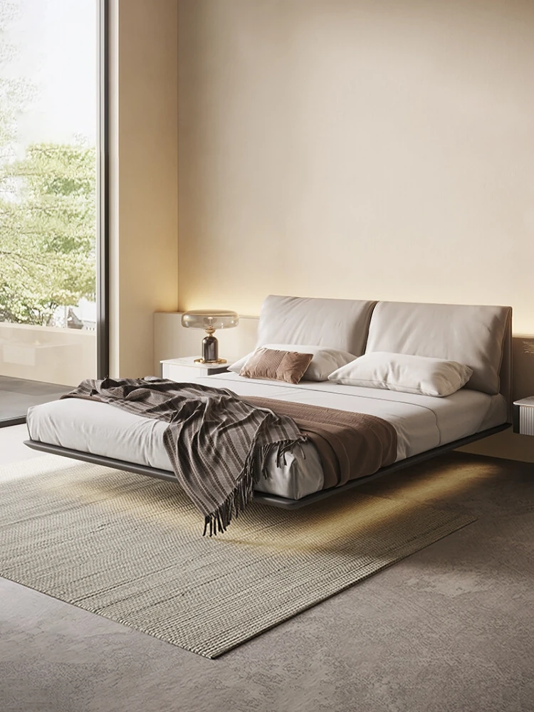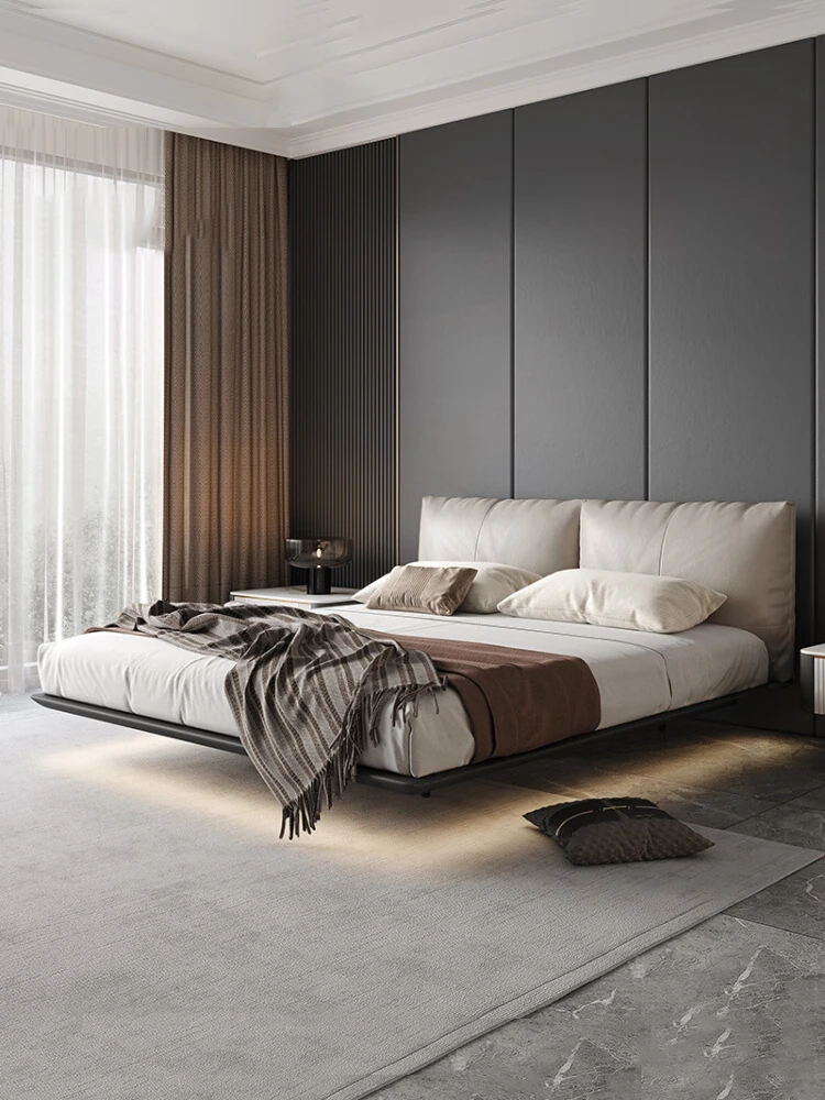 新作!浮遊感覚のラグジュアリー本革ベッド - イタリアンミニマルデザイン、洗練されたモダンな主寝室にぴったりのソフトパッケージベッド。空中に浮いているような魅力を体験して、心地よい眠りを手に入れましょう!