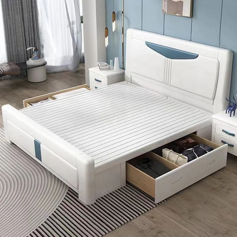モダンシンプルなホワイトの無垢材ベッド 1.8mダブル&1.5mシングルサイズ 家庭用主寝室向け スペースを有効活用できる収納付き 結婚式の特別な日にぴったり!
