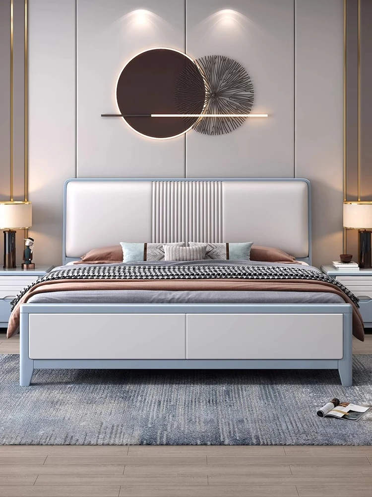 現代的なシンプルデザインの高級感あふれる無垢材ダブルベッド(1.8m)- ソフトパッド付き、収納機能付き、主寝室に最適な婚礼用ベッド!快適な睡眠を提供し、インテリアを美しく演出します。