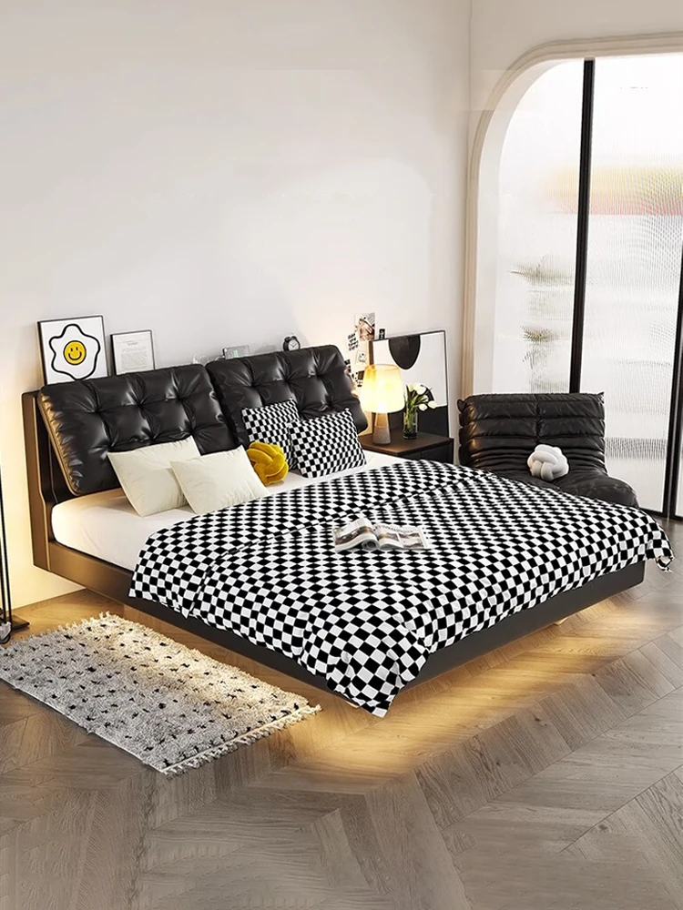 インフルエンサー推薦!シャネル本革製マスターベッドルーム用高級ダブルベッド。モダンでシンプルなデザイン、エレガントな黒のラグジュアリー浮遊ベッド。あなたの寝室に特別な魅力をプラス!