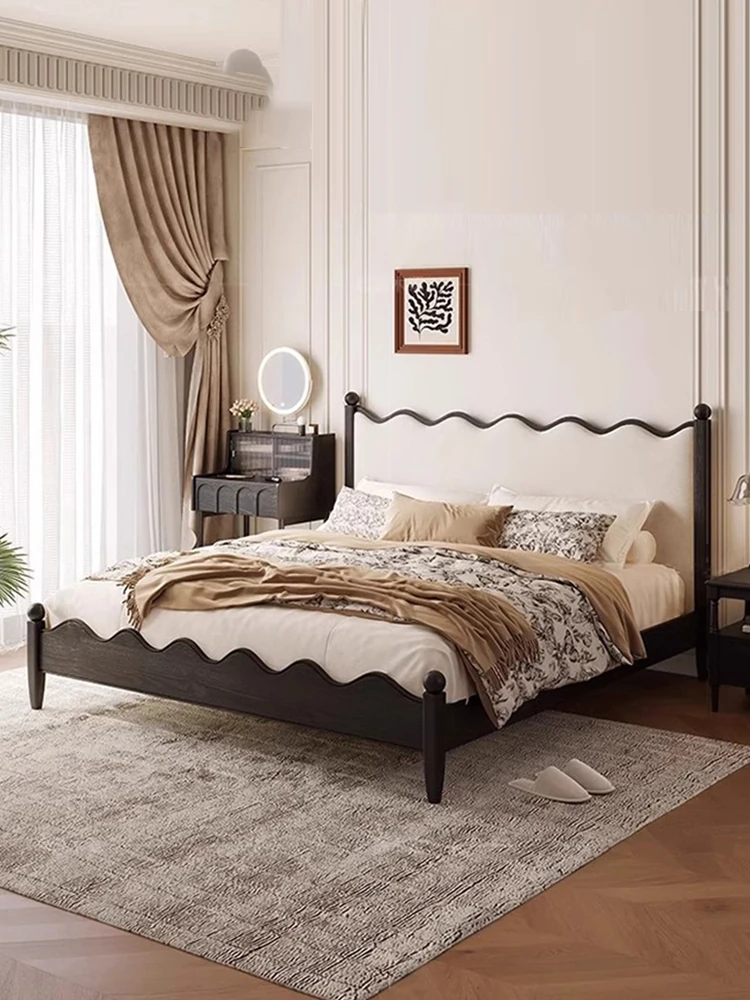 レトロな黒の無垢材ソフトパックベッド、小さなスペースに最適なホワイトアッシュ材の1.8mダブルベッド。アメリカンスタイルの主寝室用、波紋デザインで心地よい眠りをお届けします。
