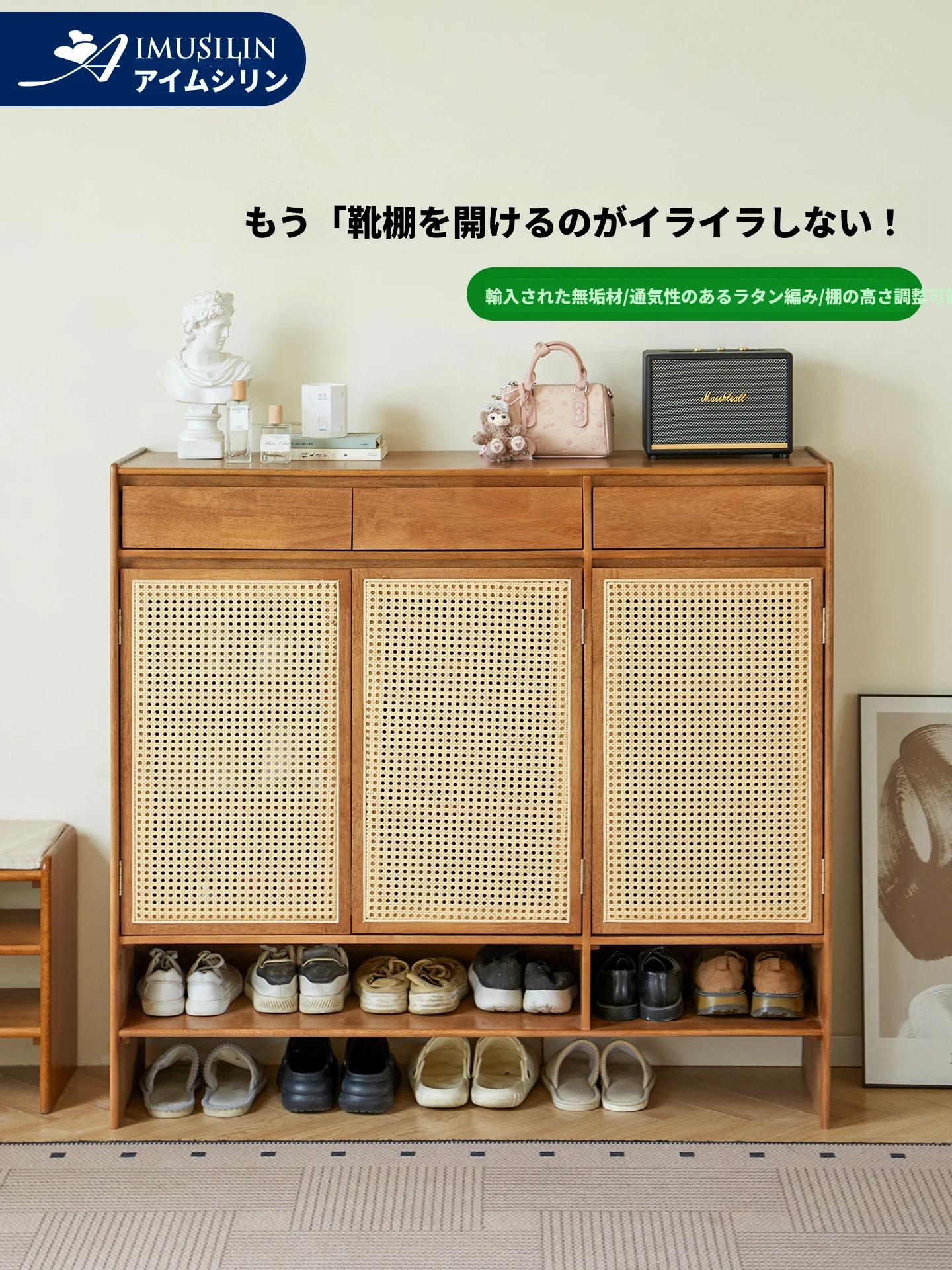高品質な無垢材製シューズキャビネット - 家庭用入り口収納キャビネット!大容量・多層構造で、エントランスや廊下にぴったりのスタイリッシュなラタン編みデザイン。靴の整理も簡単に!おしゃれな玄関を演出します。