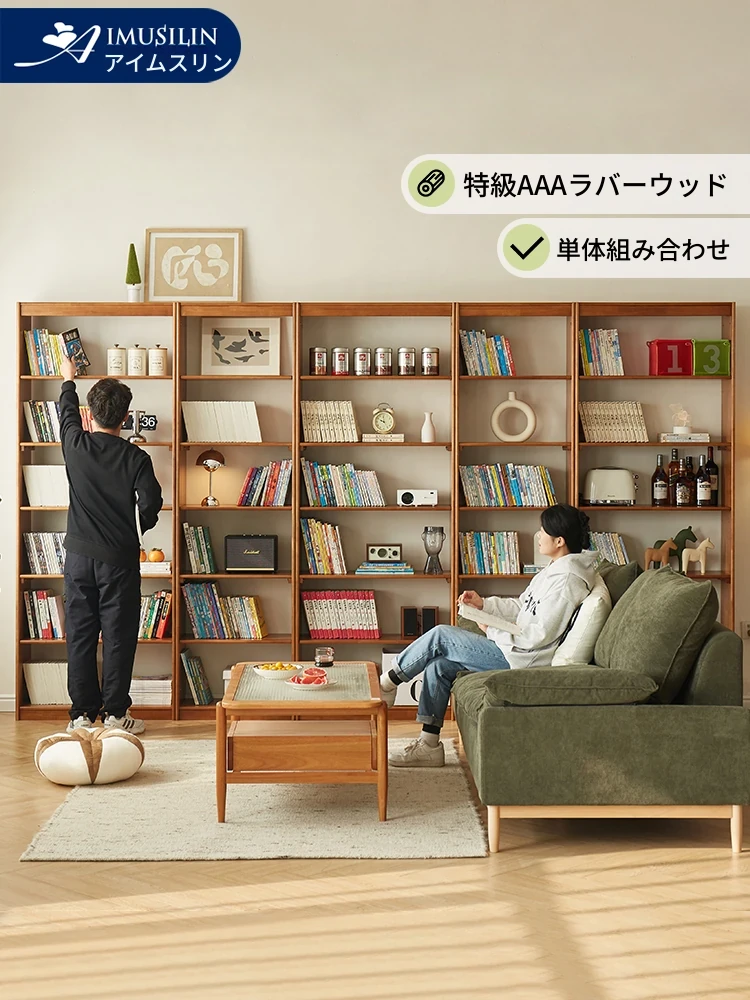 全木製の壁一体型収納書棚 - 床置きタイプでお部屋をスタイリッシュに!リビングにぴったりな収納力抜群の書架、スッキリとした骨格ラインで美しい整理整頓を実現します。