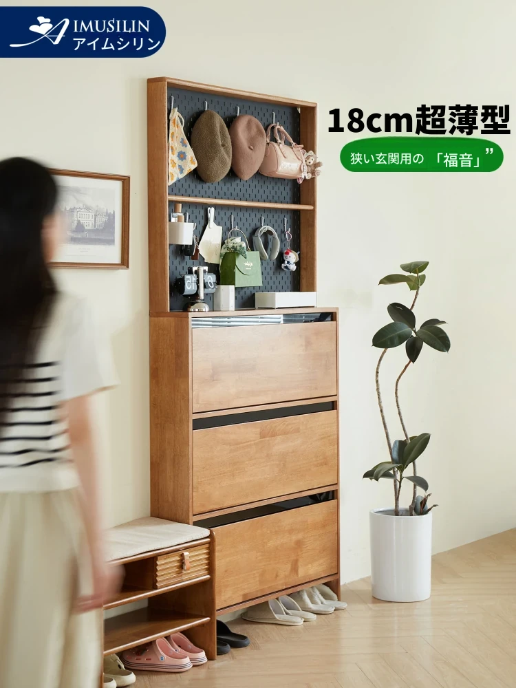 スリムなデザインの天然木製シューズキャビネット - 家庭用の玄関に最適な大容量収納!衣類・帽子ラック一体型、壁に寄せて設置可能な18cm薄型収納キャビネットで、スッキリとしたエントランスを実現!