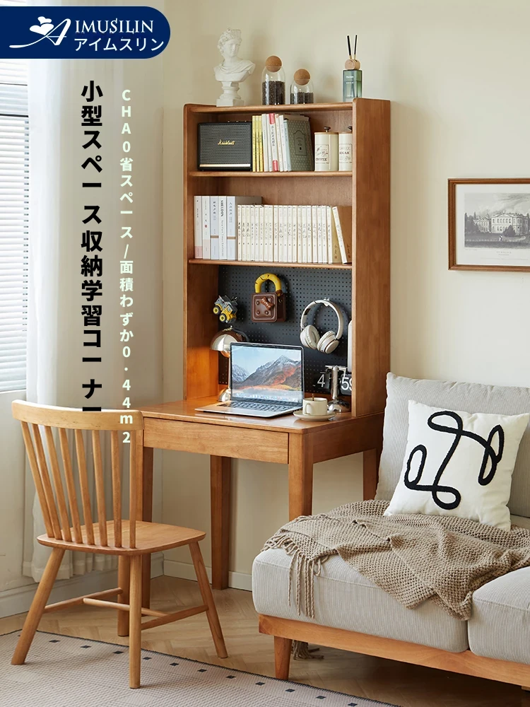 天然木製のデスク&書棚一体型!省スペースでスタイリッシュな学生用学習机、寝室にも最適。ナチュラルな風合いで、リラックスした学びの空間を演出。