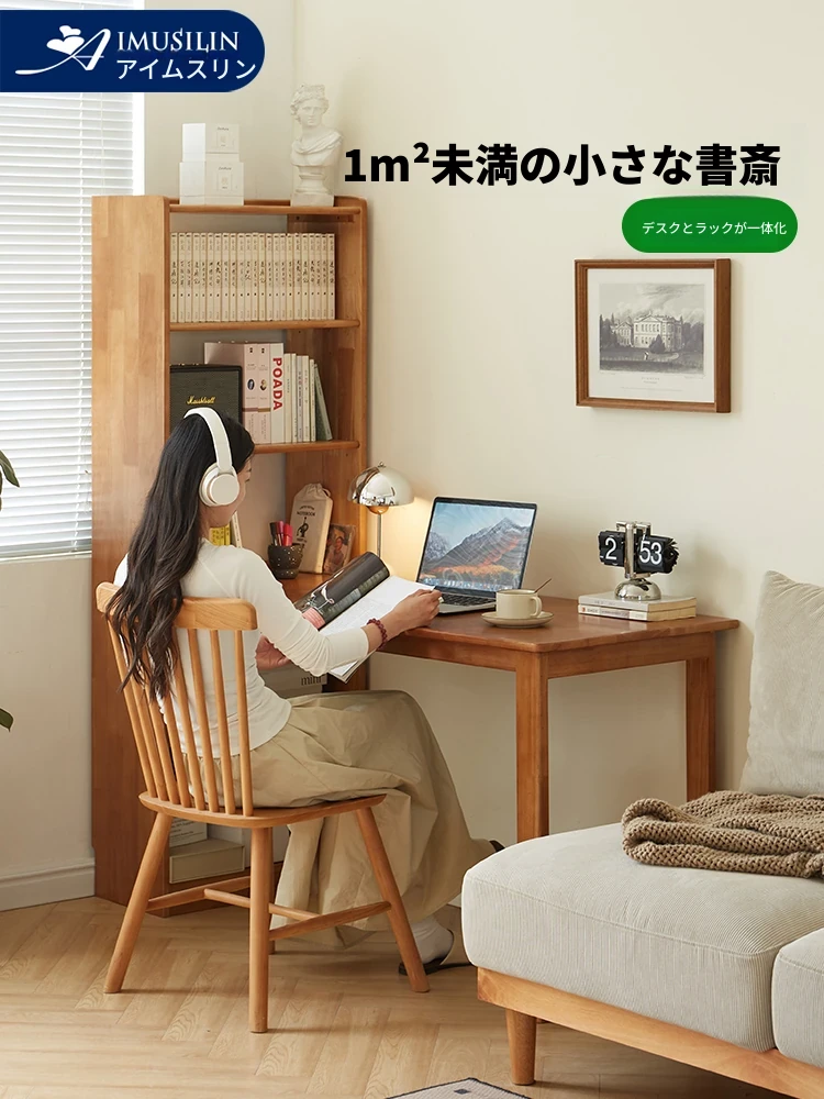シンプルで機能的な実木の学生用デスク&書棚一体型コーナーデスク - 小スペースに最適なコンパクトな学習机、収納力抜群のパソコンデスク!