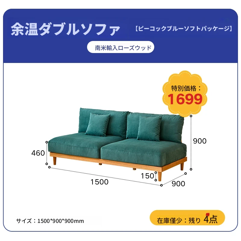孔雀ブルーのダブルソファ(1500*900*900mm)