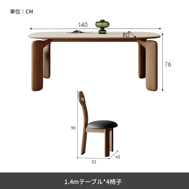 1.4メートル ダイニングテーブル + キーチェア *4 全実木 ホワイトアッシュ + 12mm 洞石岩板