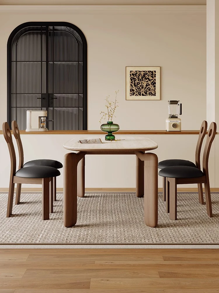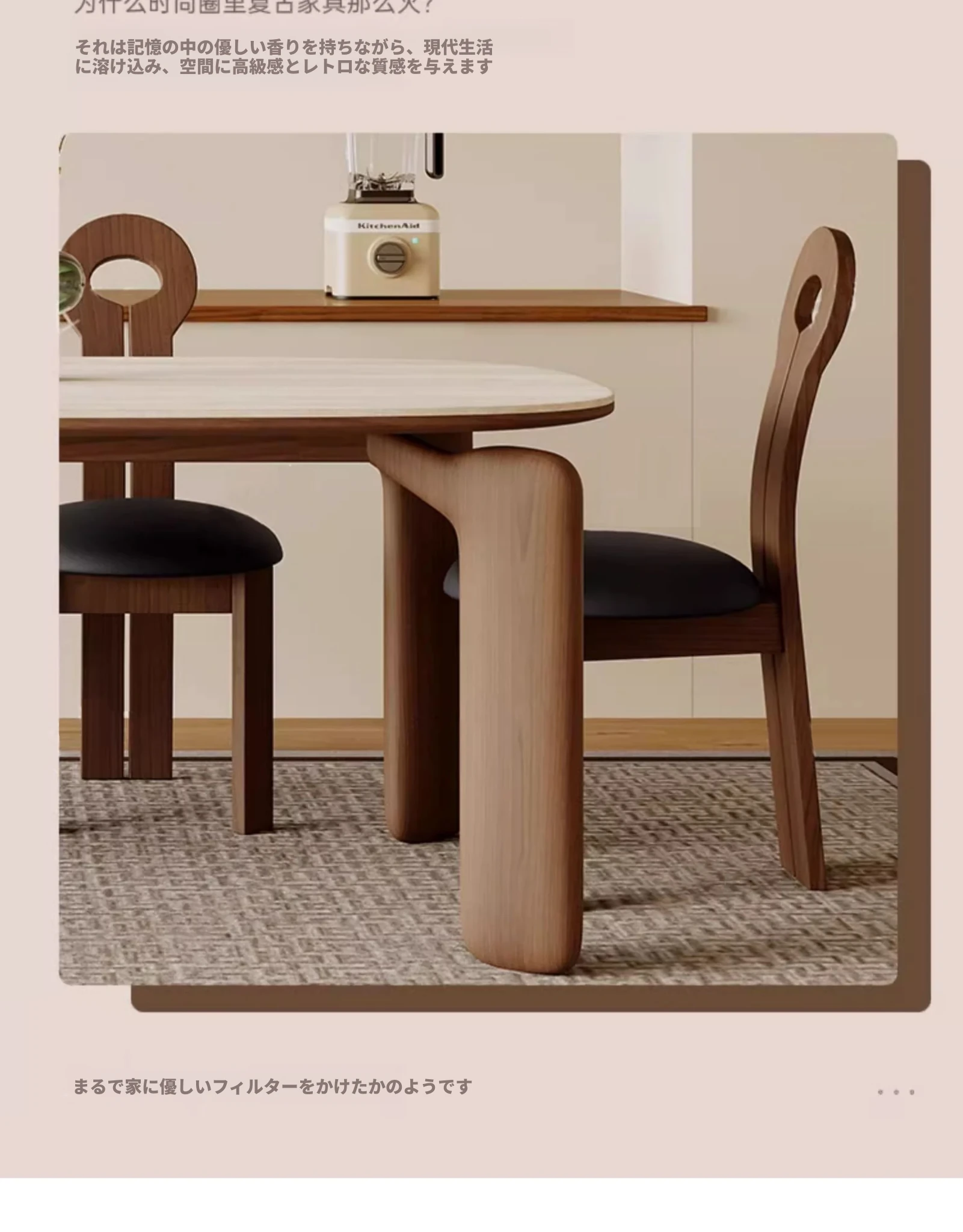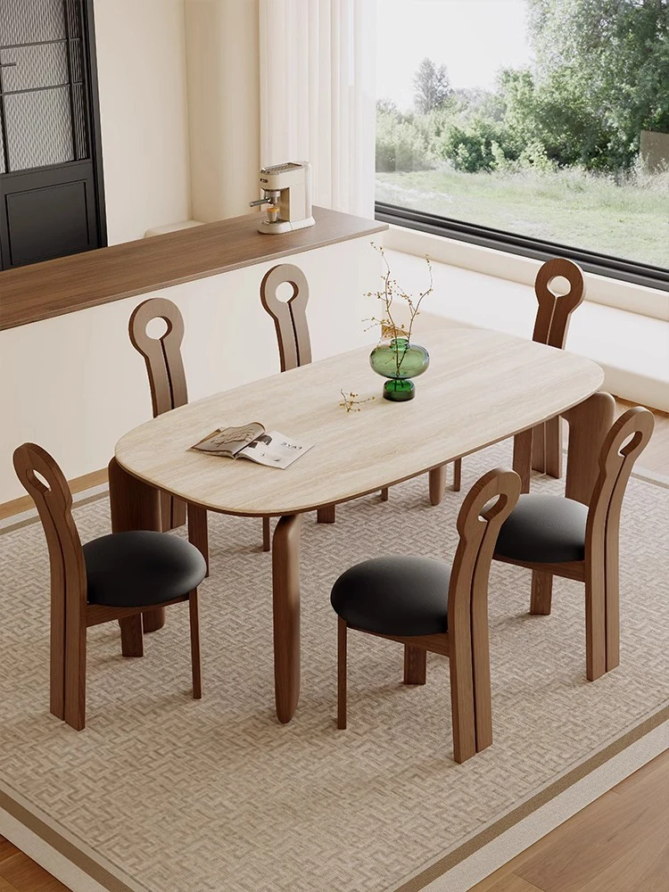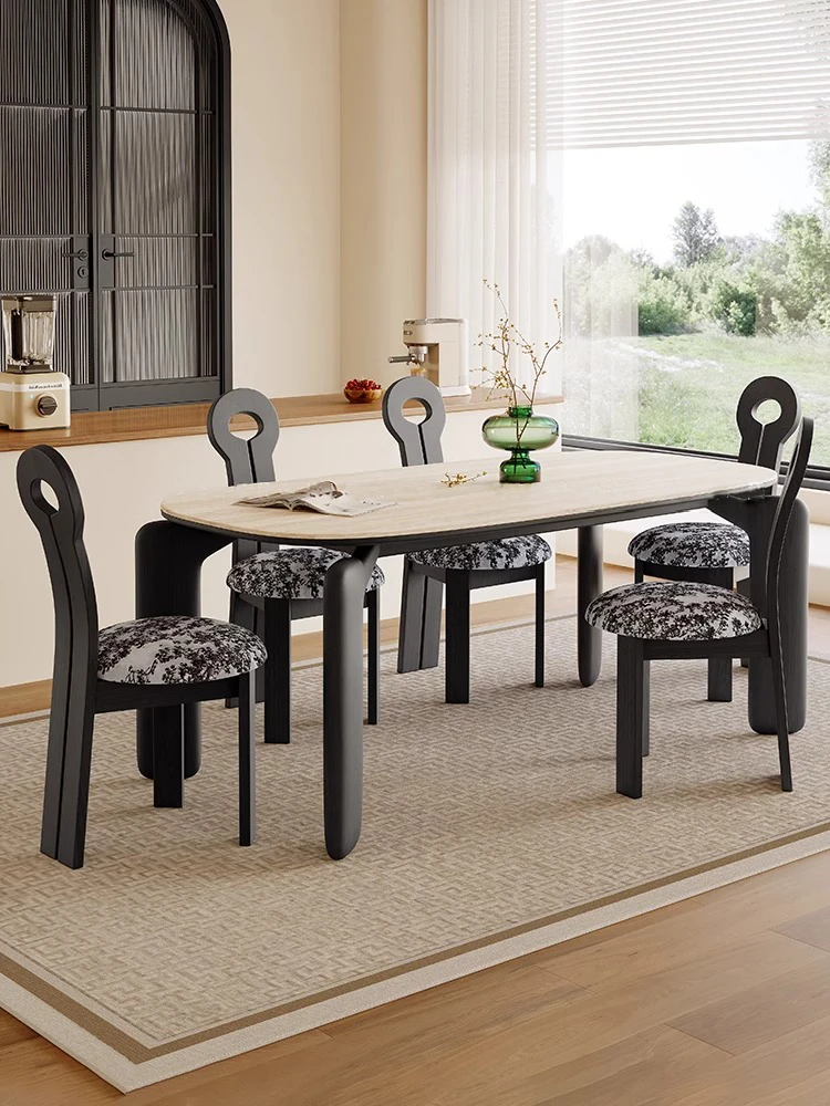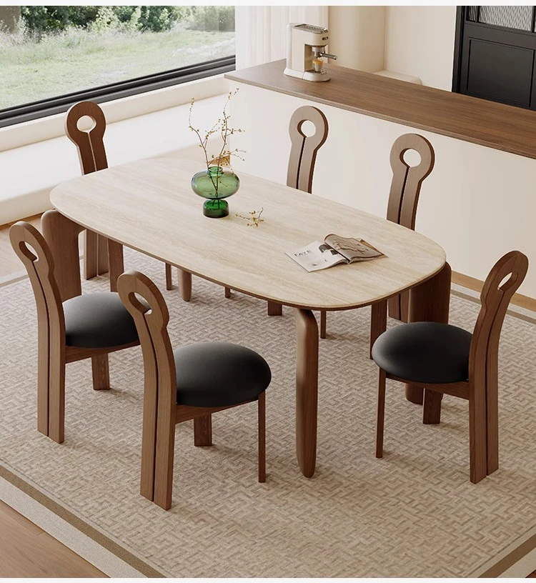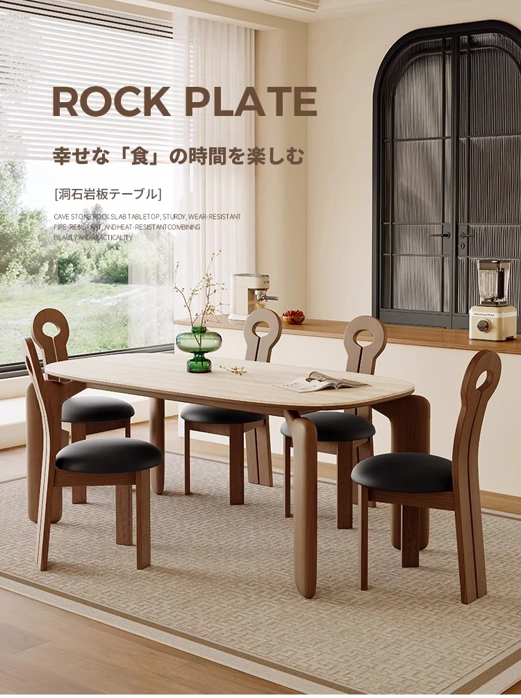 安居坊の侘寂スタイルのアンティーク風洞石岩板実木ダイニングテーブル&チェアセット - 高級フレンチデザイン、小型住宅にぴったりのエレガントな食卓!