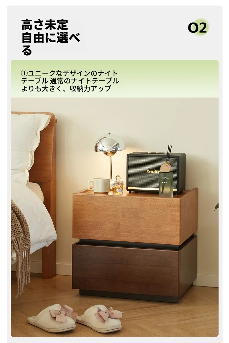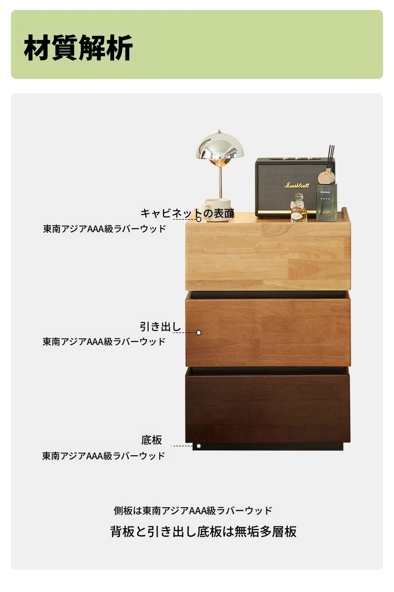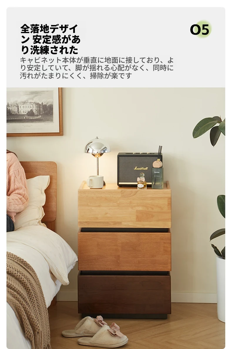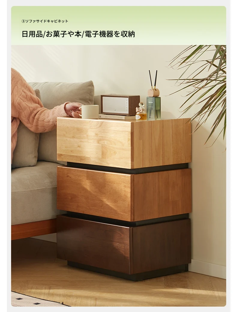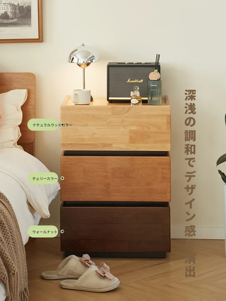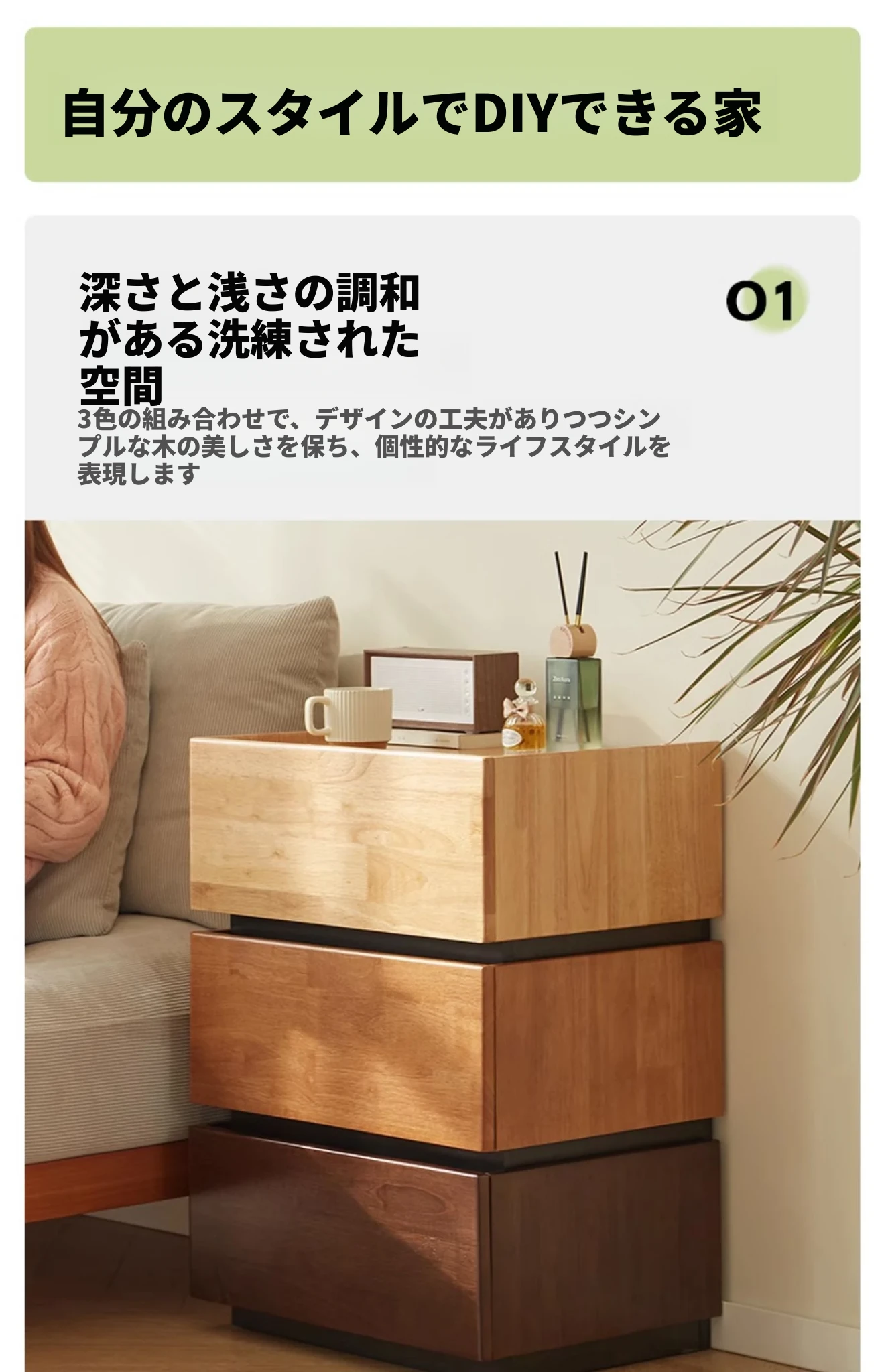 シンプルでモダンな実木製ベッドサイドテーブル - 寝室やリビングに最適な収納力抜群の引き出し付きキャビネット!壁に寄せて使えるデザインで、空間を有効活用しながらスタイリッシュに。