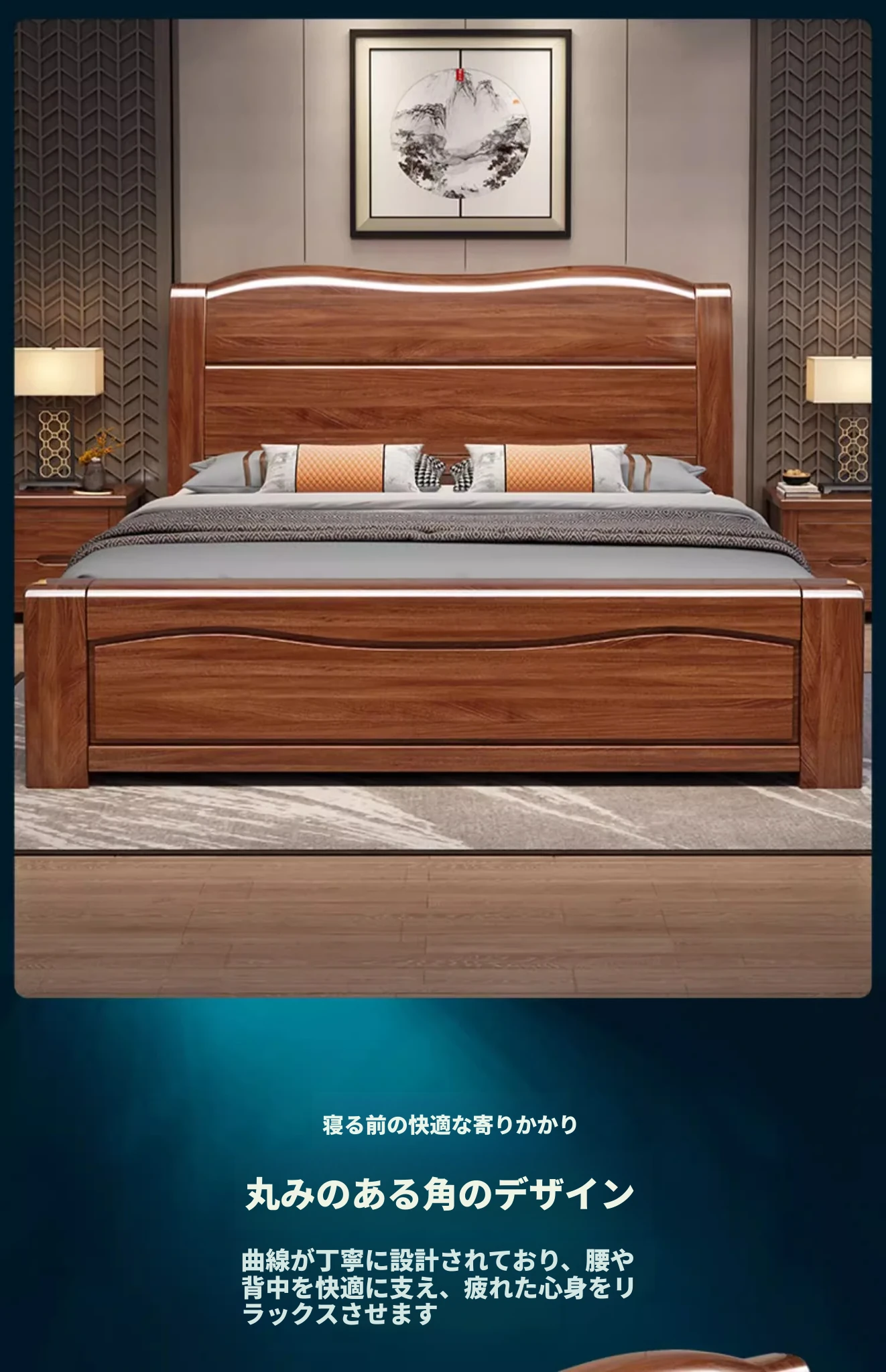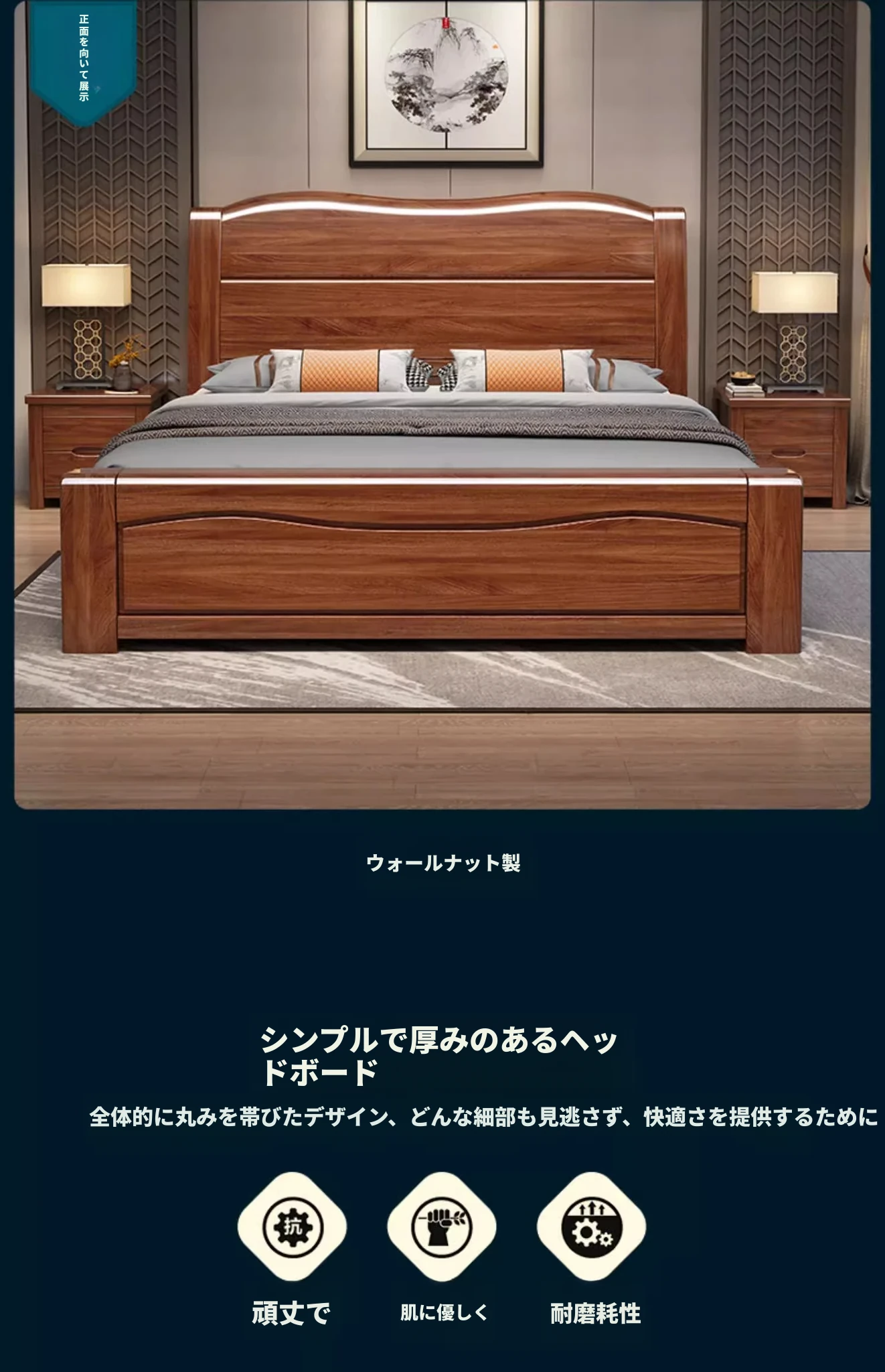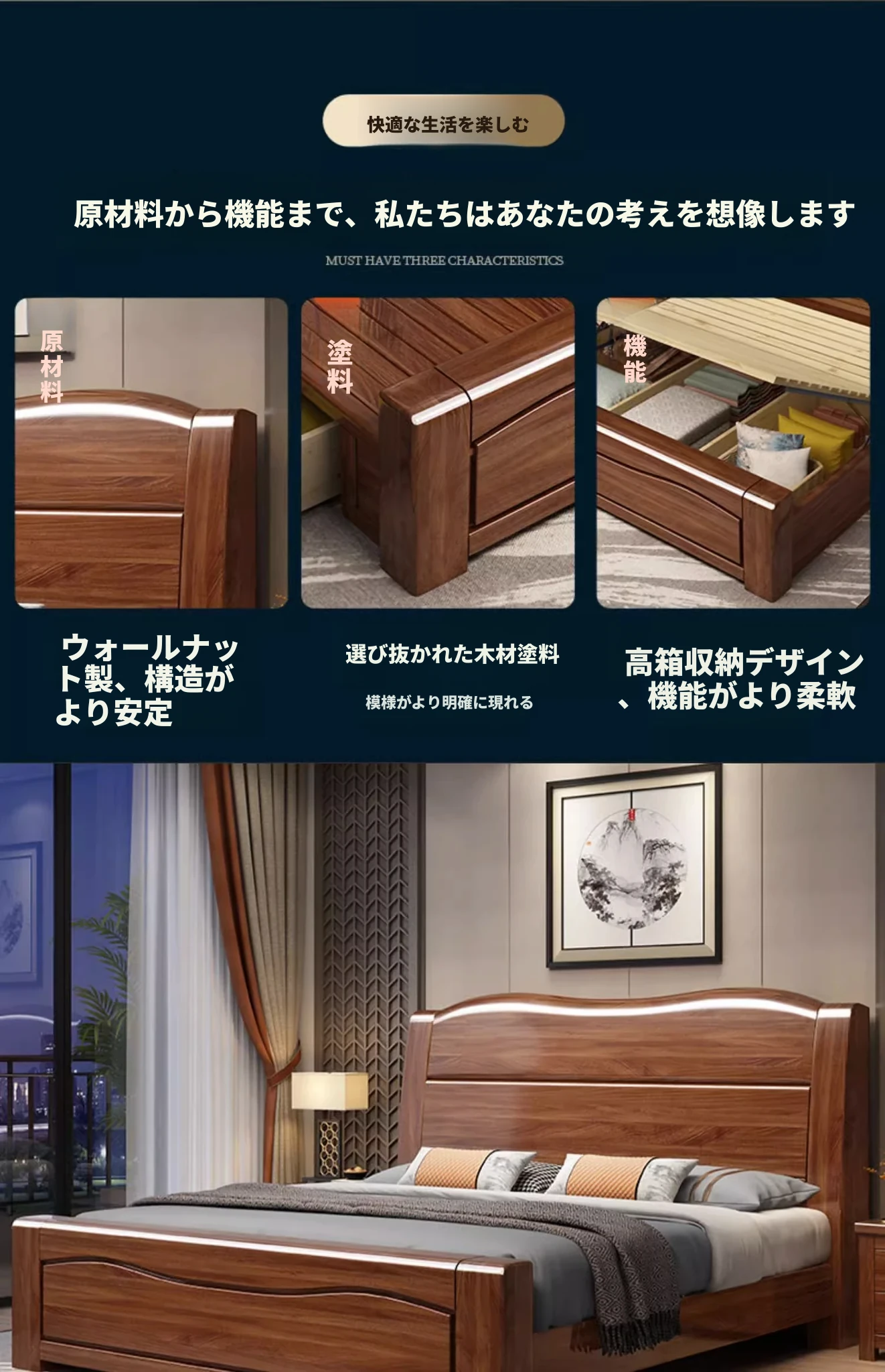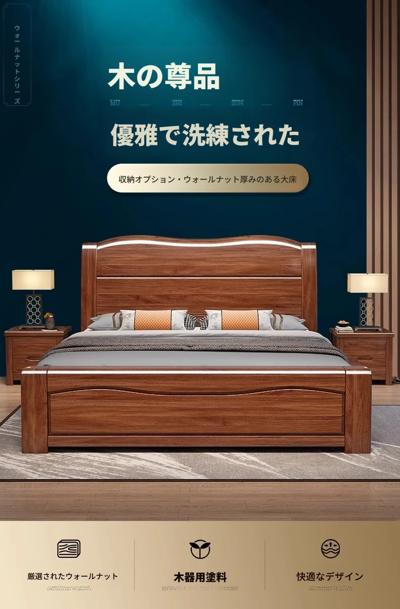 金色のクルミの無垢材を使用した北欧スタイルのラグジュアリー新中式デザイン、真皮ソフトパッキング付きの高箱収納主寝室用大婚ベッド。贅沢な空間を演出し、機能性も兼ね備えた理想のベッドです!