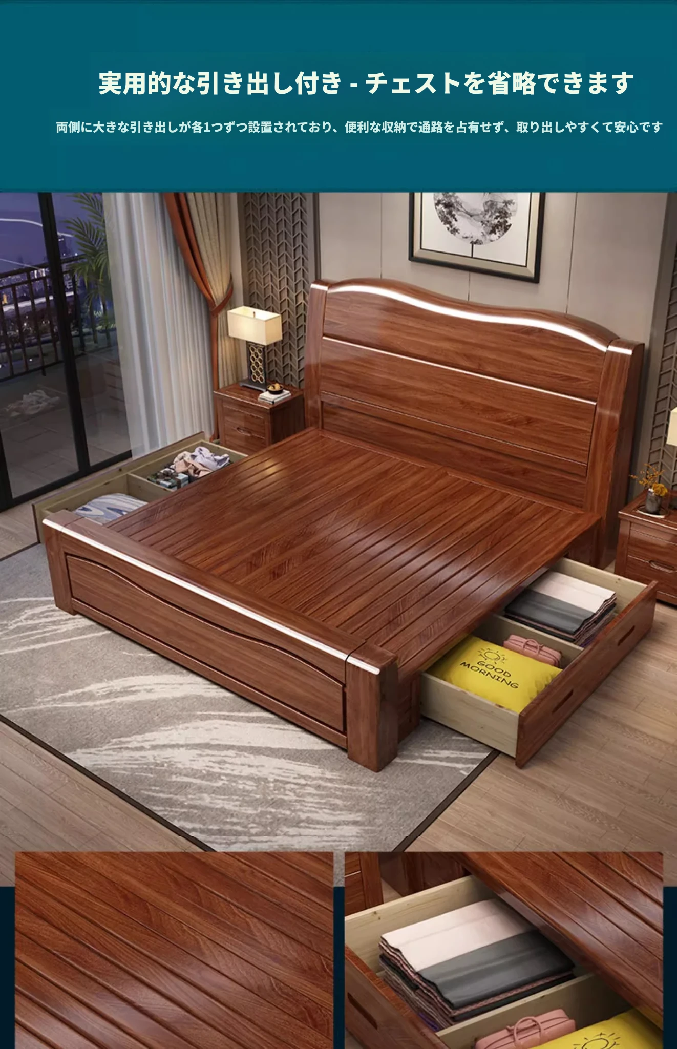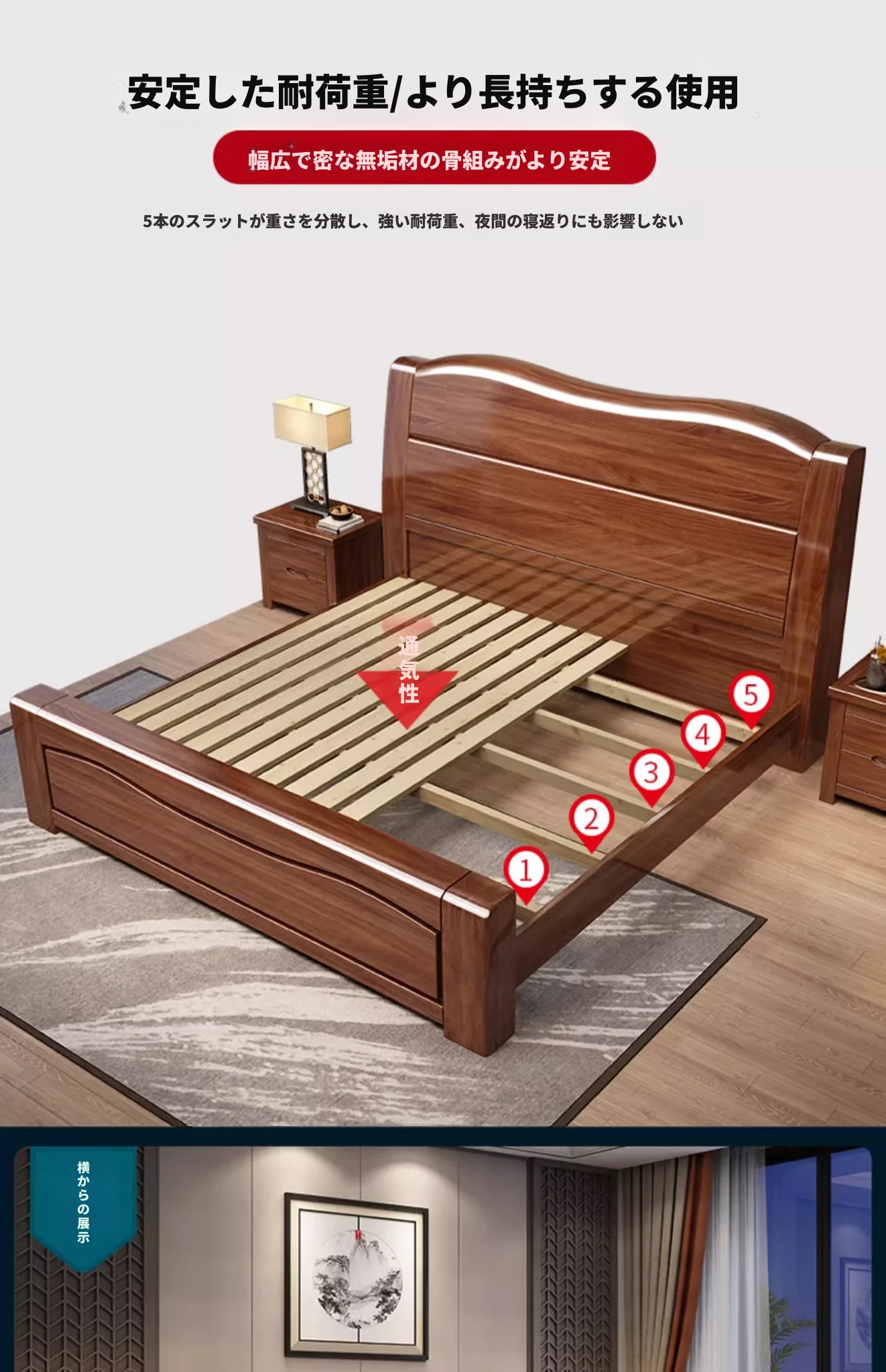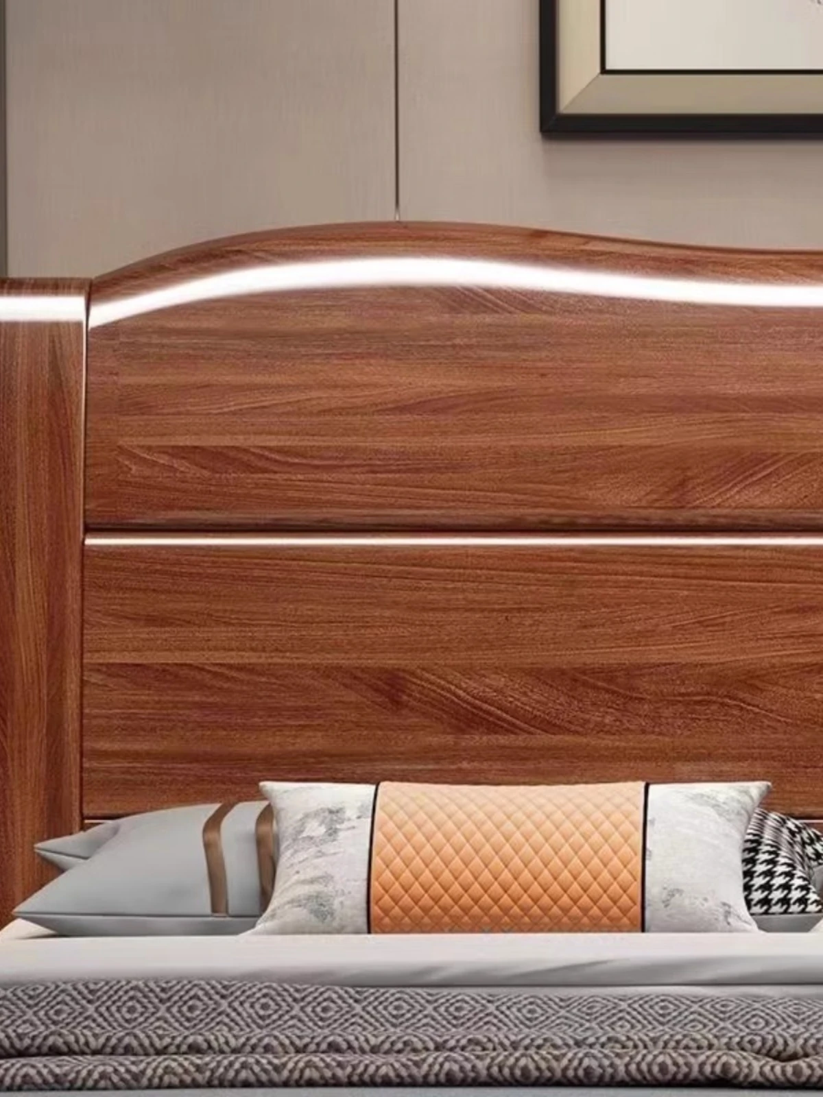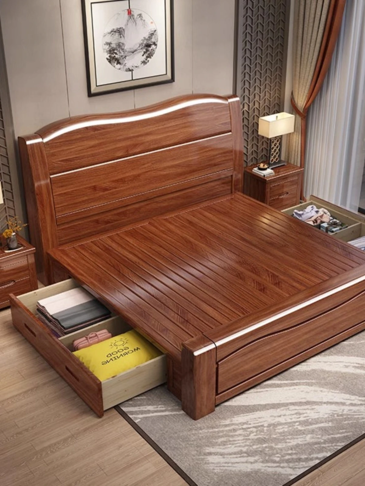 金色のクルミの無垢材を使用した北欧スタイルのラグジュアリー新中式デザイン、真皮ソフトパッキング付きの高箱収納主寝室用大婚ベッド。贅沢な空間を演出し、機能性も兼ね備えた理想のベッドです!
