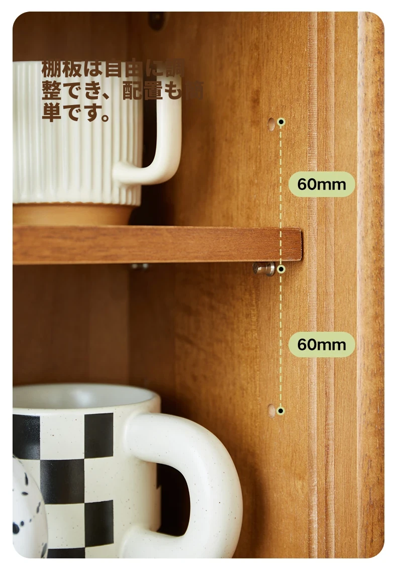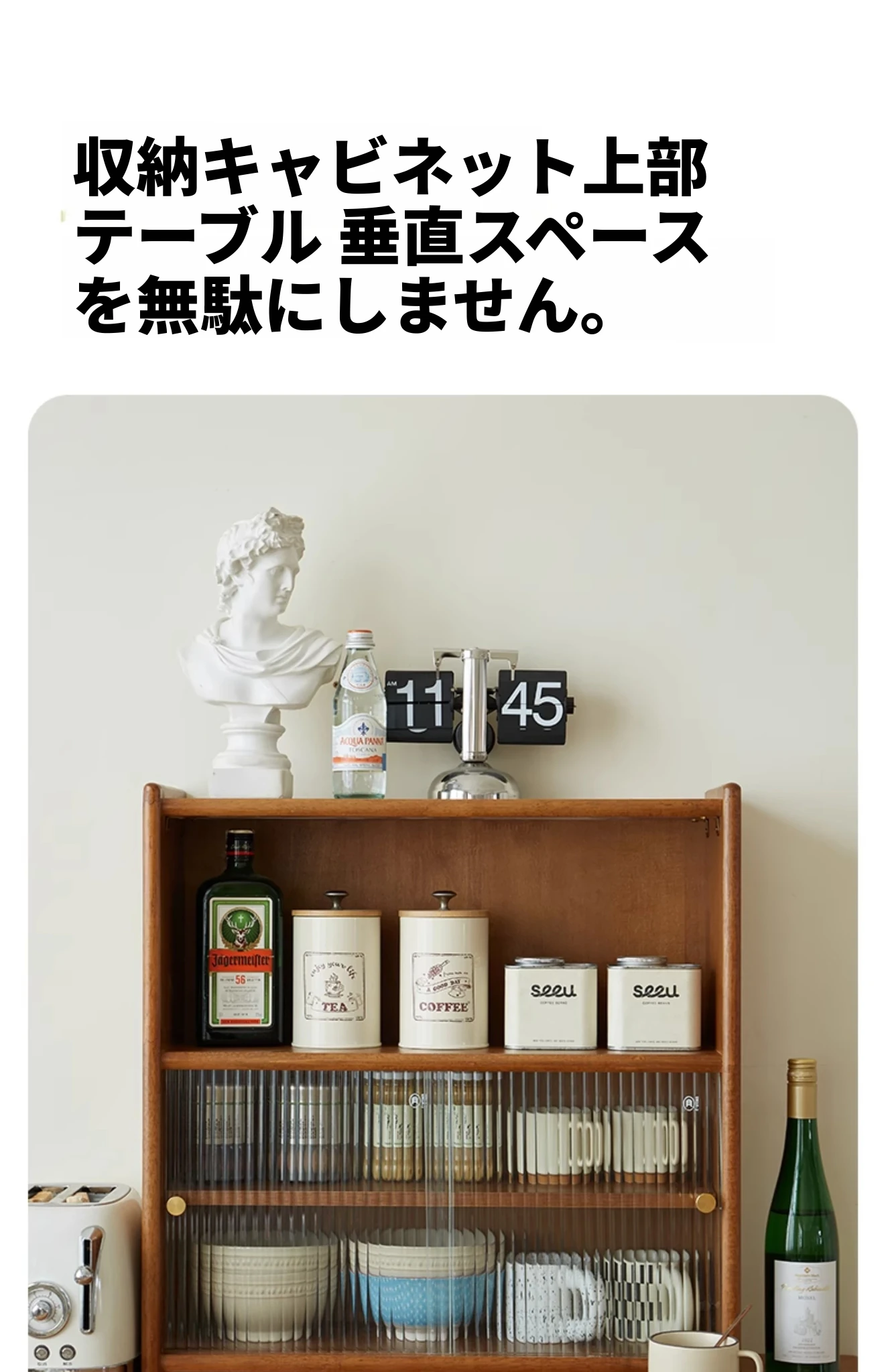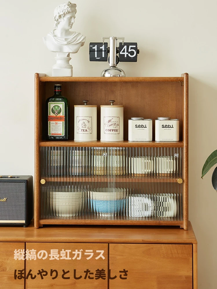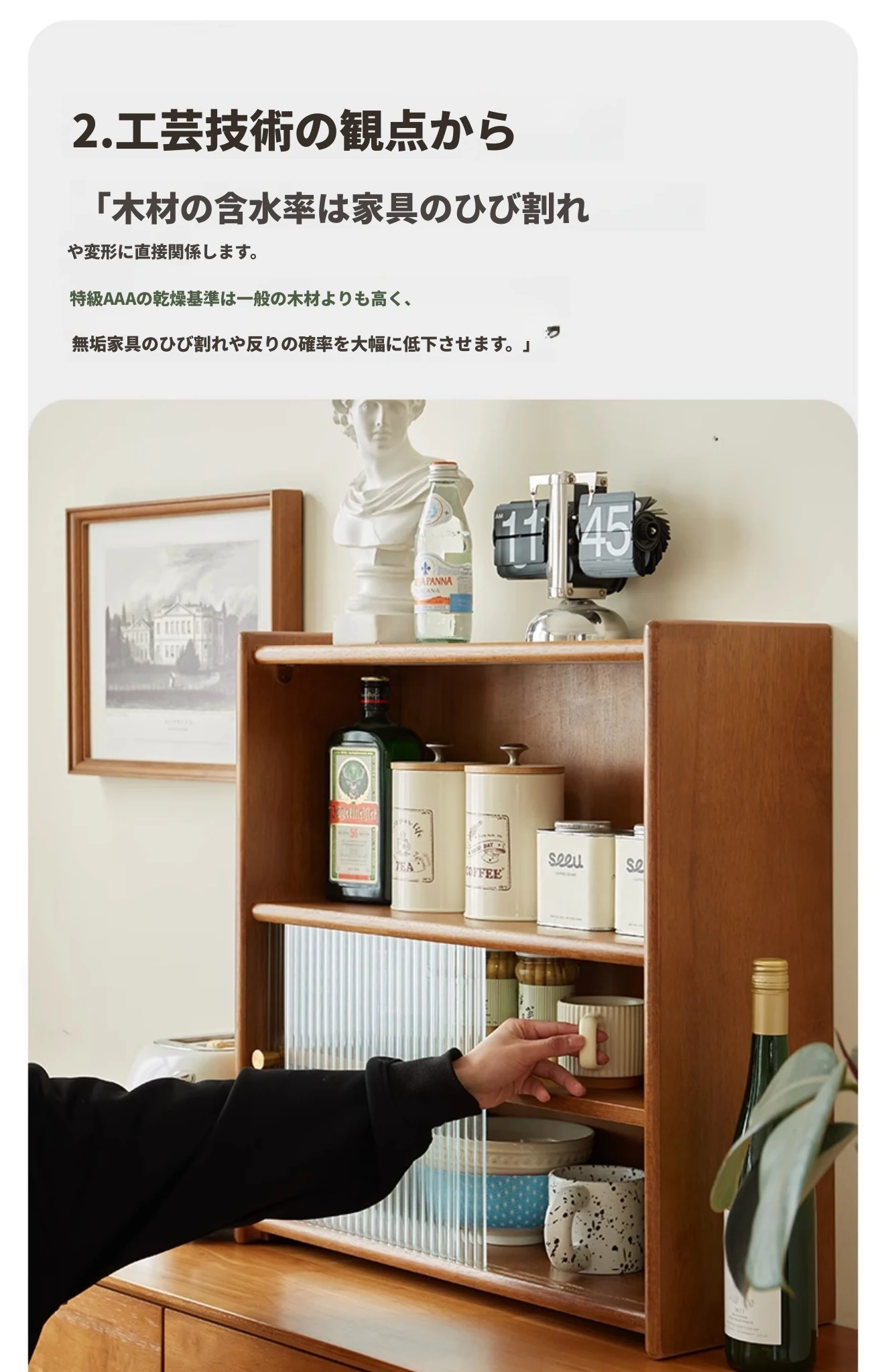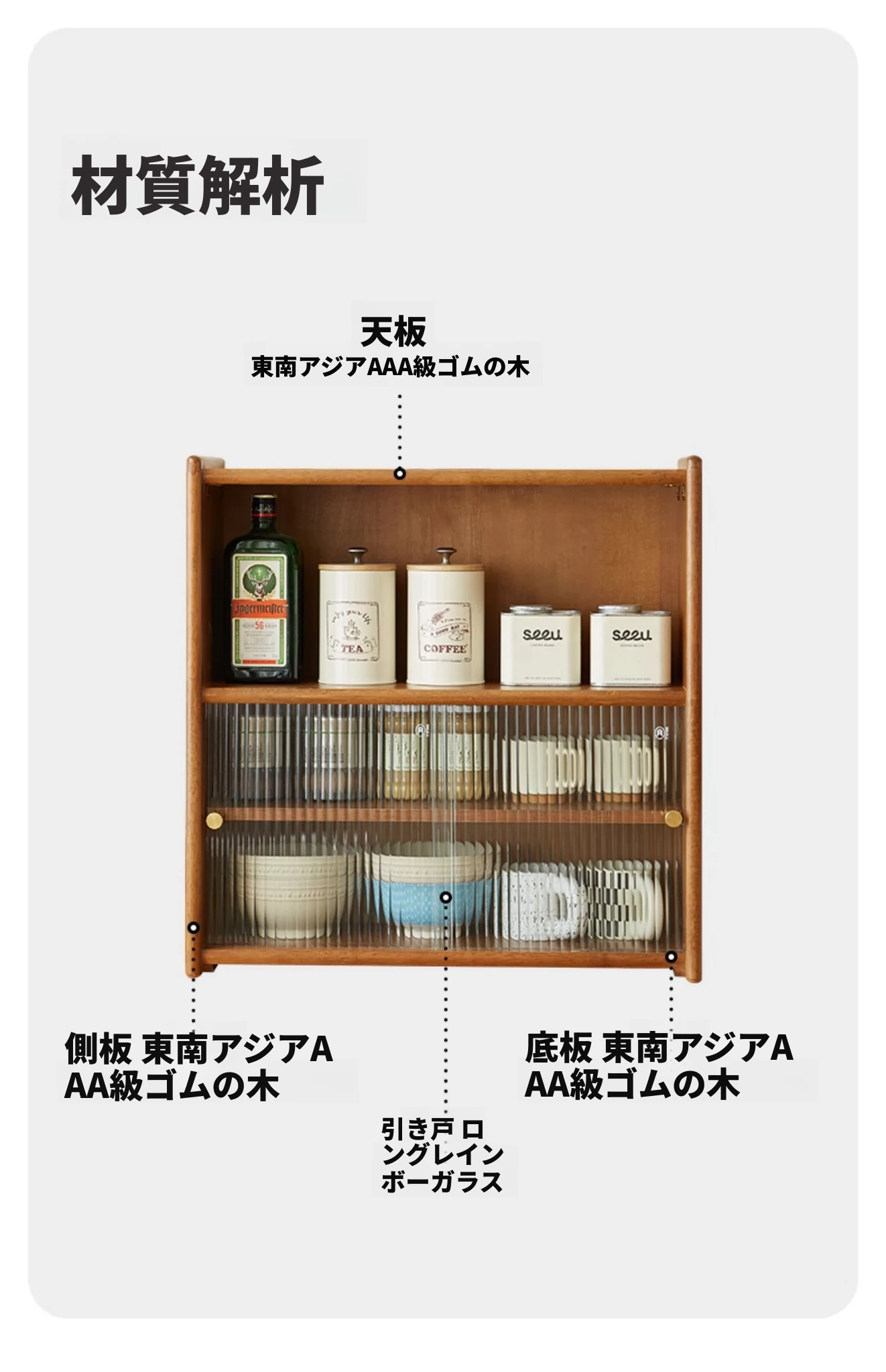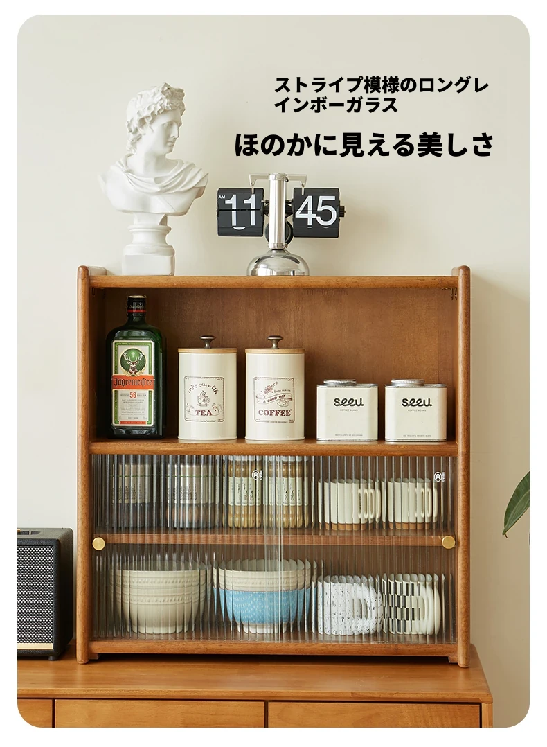 天然木製のサイドボード - リビングをスタイリッシュに演出!壁付け収納でスペースを有効活用。コーヒーカップラックやフィギュアディスプレイにも最適な多機能収納キャビネット。食卓や食器の整理整頓にぴったり!
