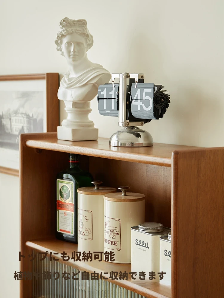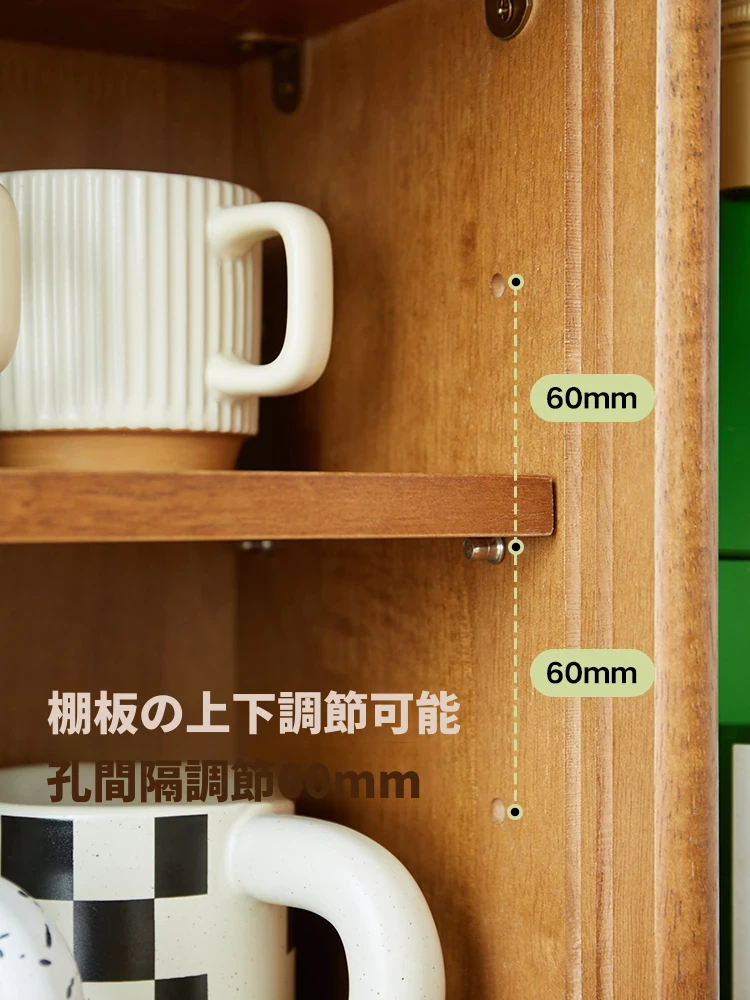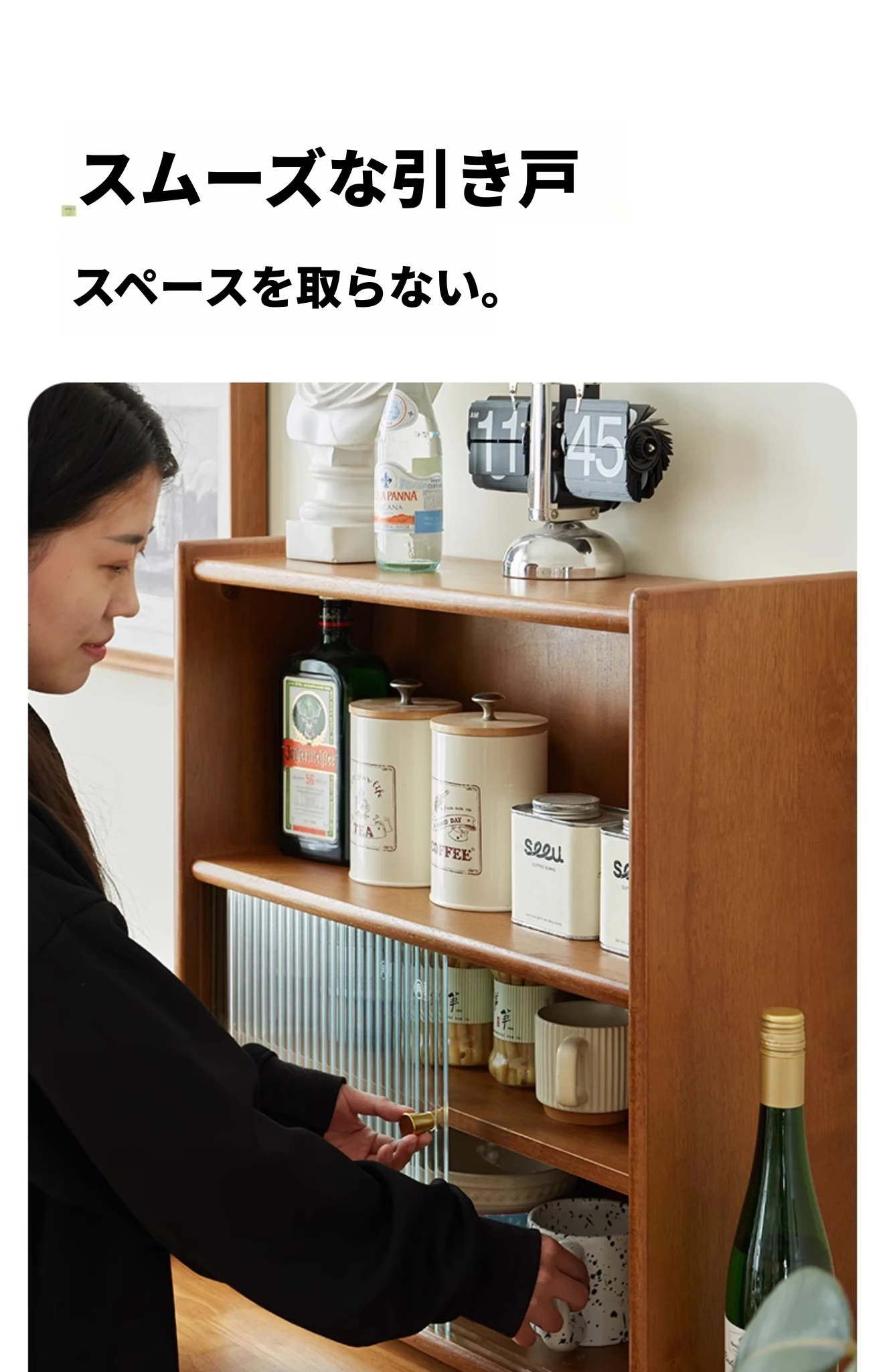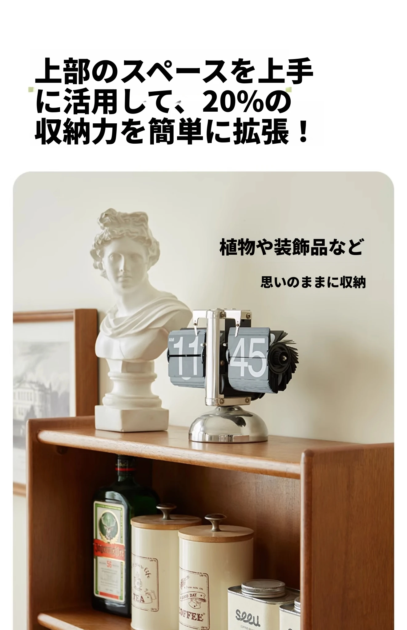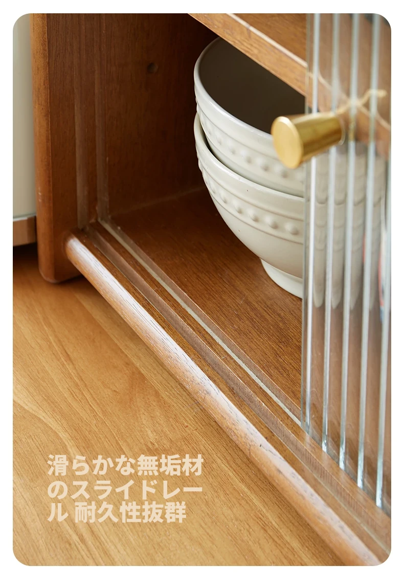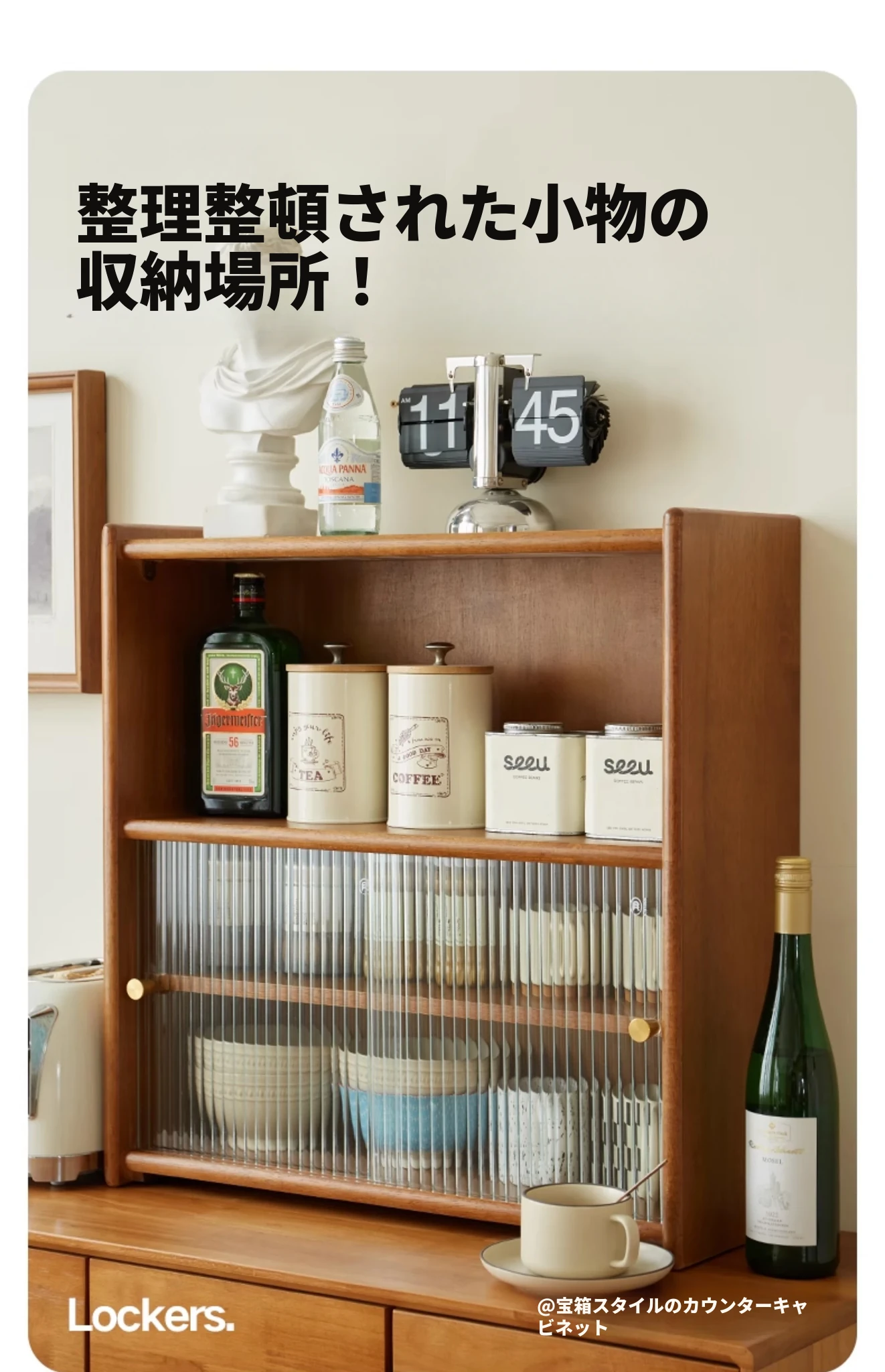 天然木製のサイドボード - リビングをスタイリッシュに演出!壁付け収納でスペースを有効活用。コーヒーカップラックやフィギュアディスプレイにも最適な多機能収納キャビネット。食卓や食器の整理整頓にぴったり!