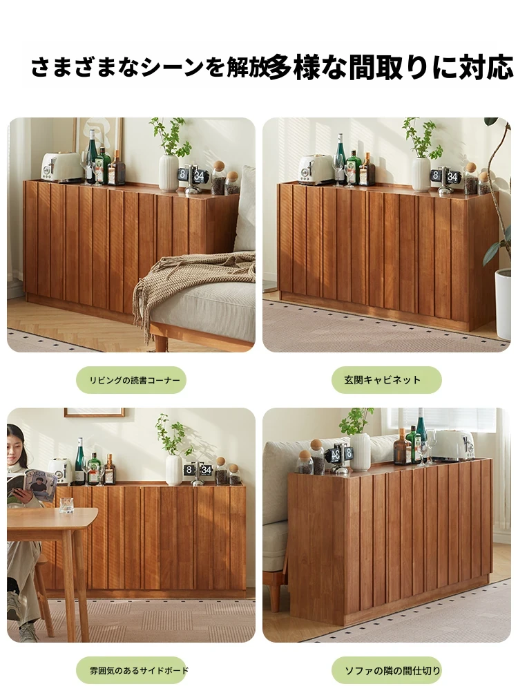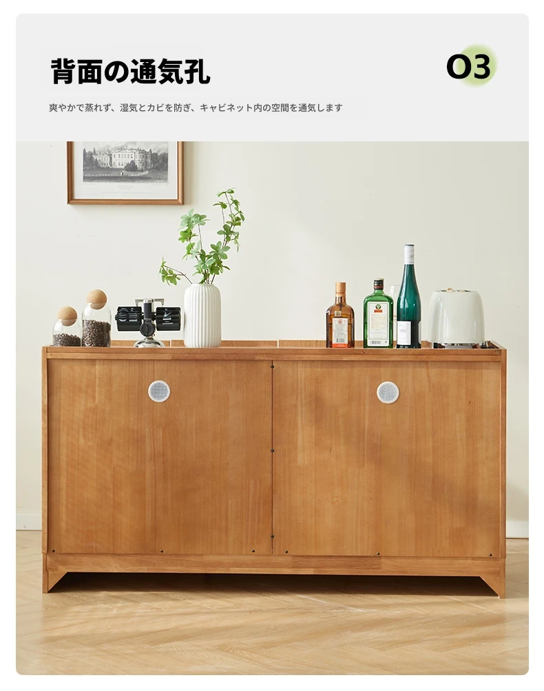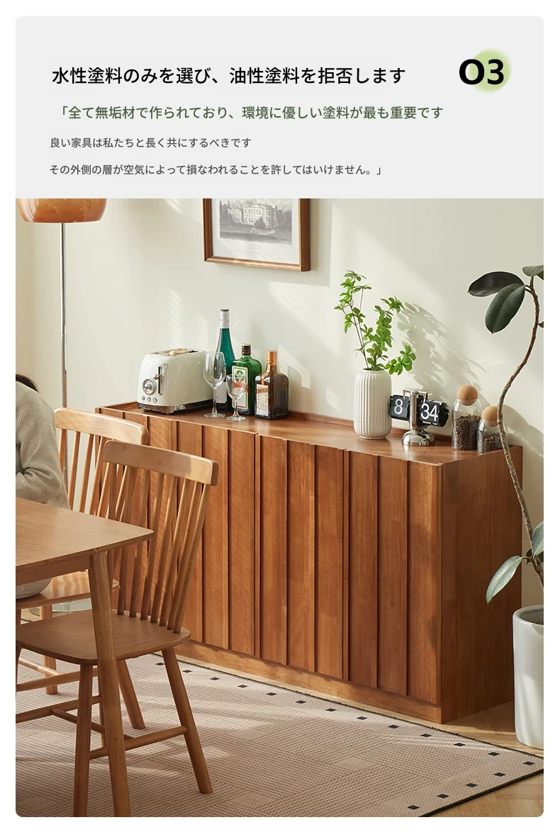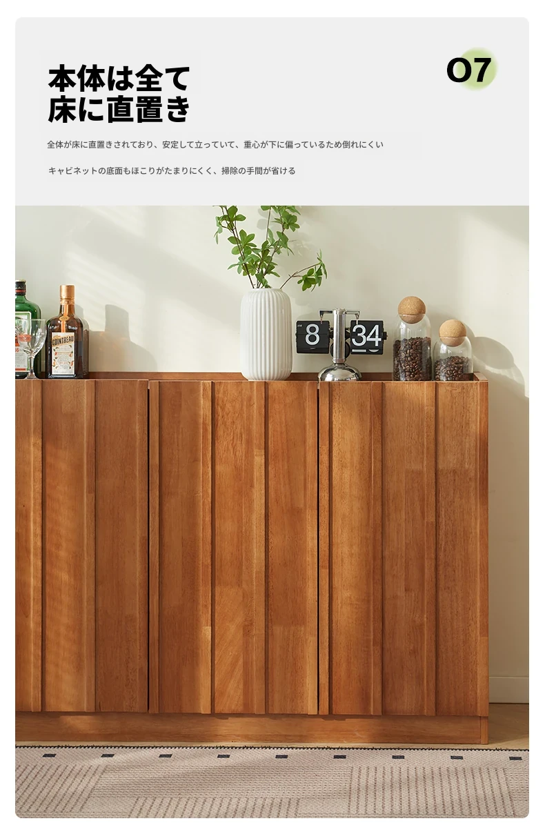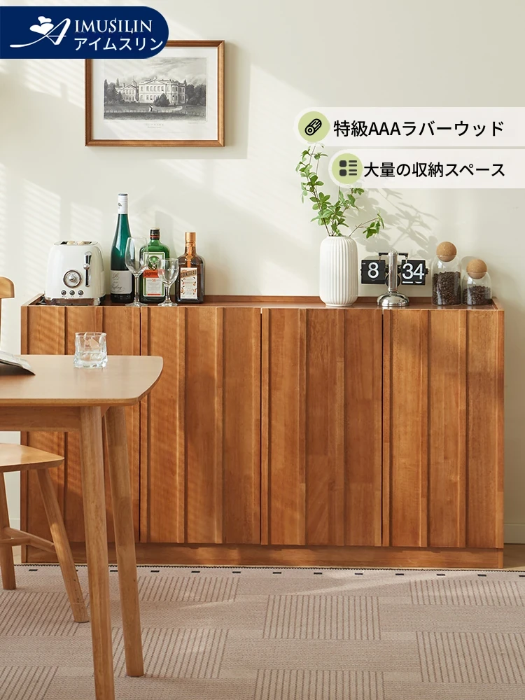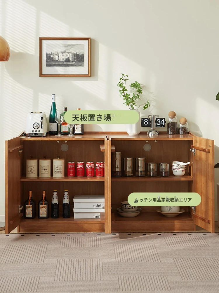 ウォールにぴったりフィット!高品質の無垢材を使用したダイニングサイドキャビネット。収納力抜群のローボードで、リビングやキッチンに最適なティーキャビネット。おしゃれなデザインで、家のインテリアを引き立てます!