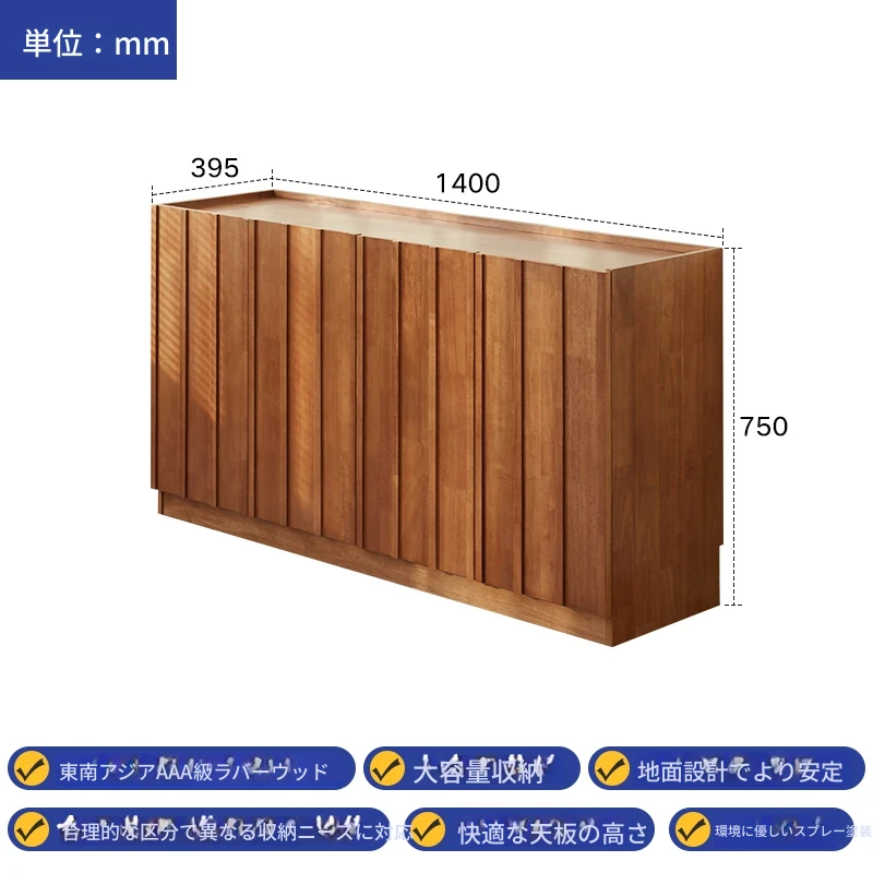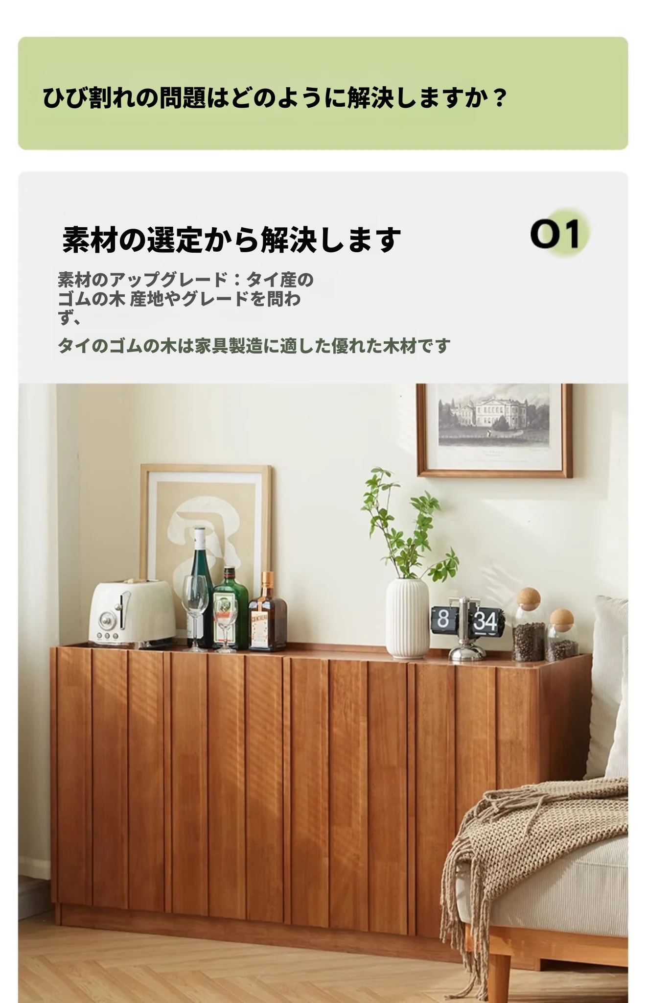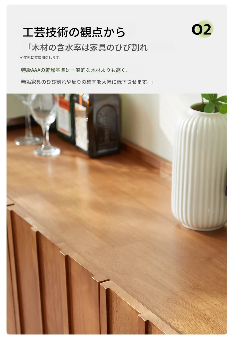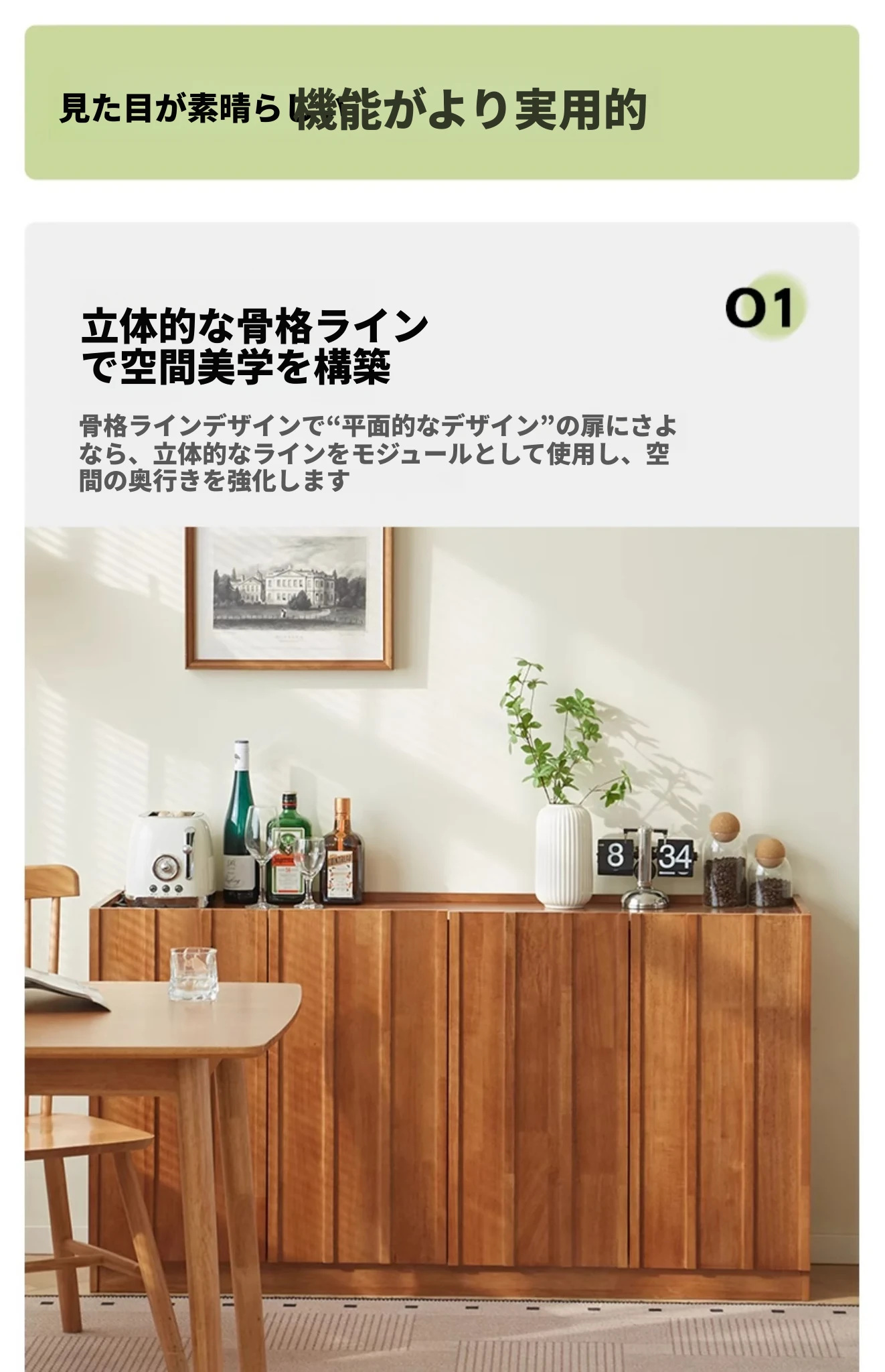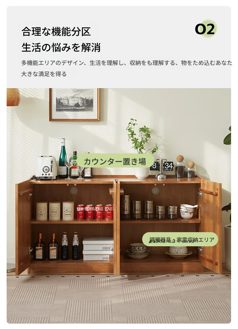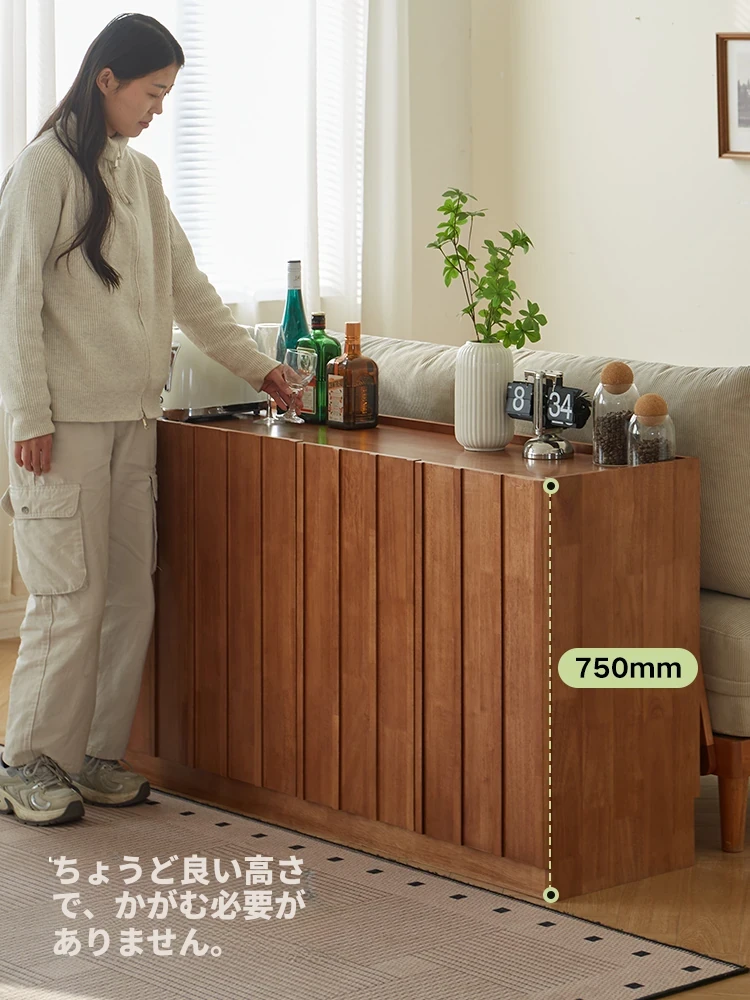 ウォールにぴったりフィット!高品質の無垢材を使用したダイニングサイドキャビネット。収納力抜群のローボードで、リビングやキッチンに最適なティーキャビネット。おしゃれなデザインで、家のインテリアを引き立てます!