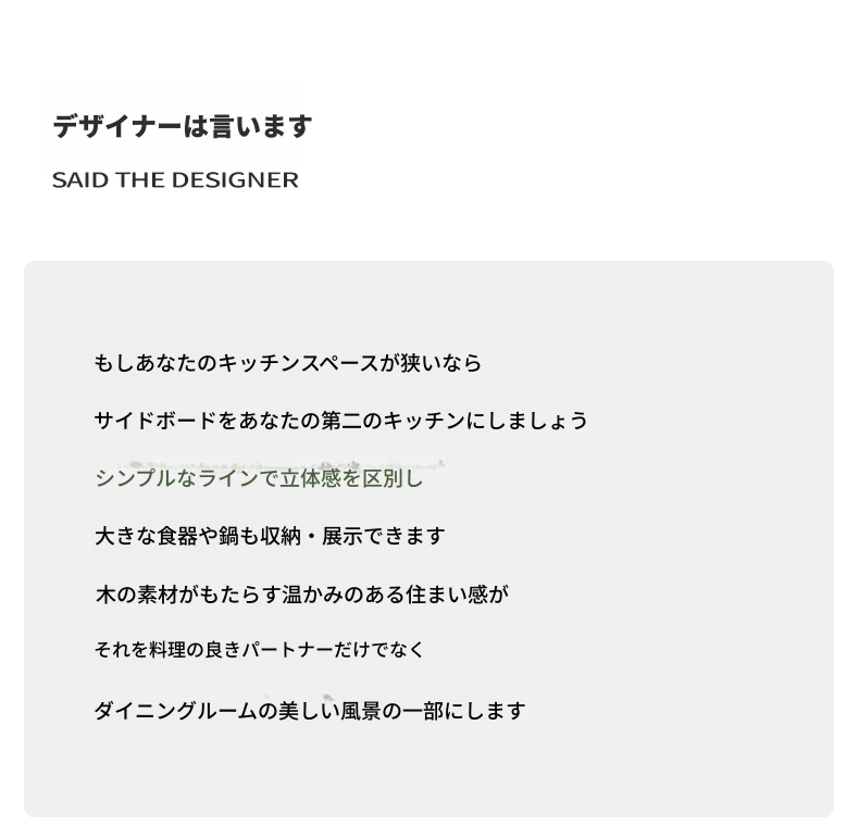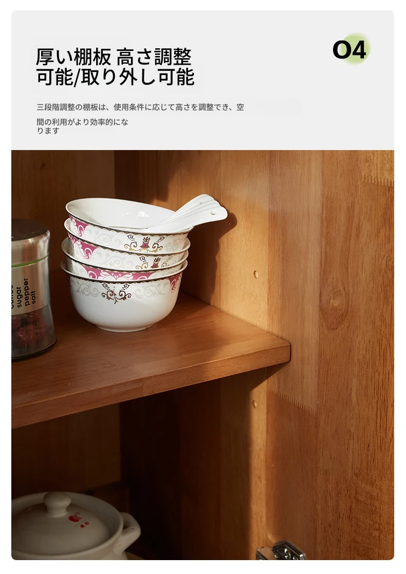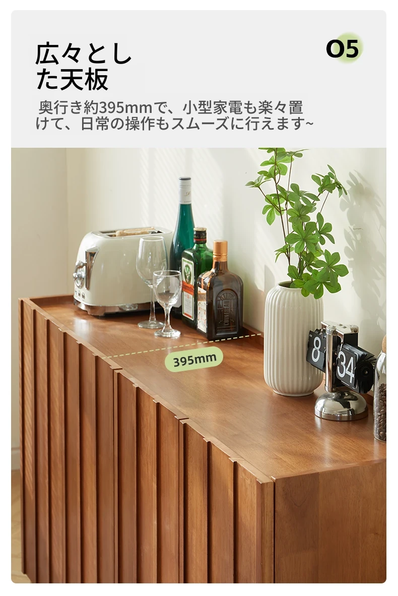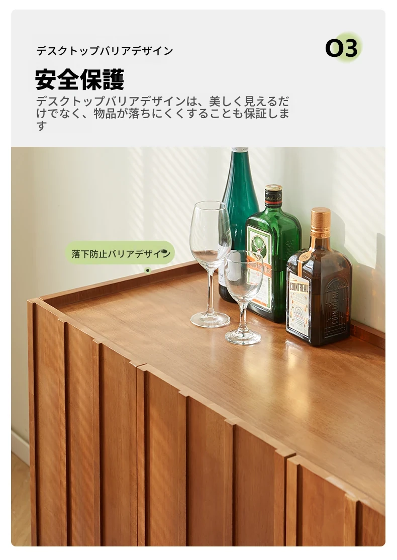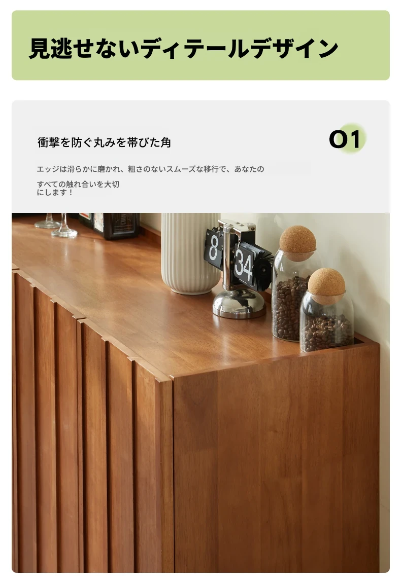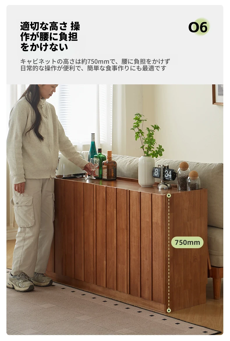 ウォールにぴったりフィット!高品質の無垢材を使用したダイニングサイドキャビネット。収納力抜群のローボードで、リビングやキッチンに最適なティーキャビネット。おしゃれなデザインで、家のインテリアを引き立てます!