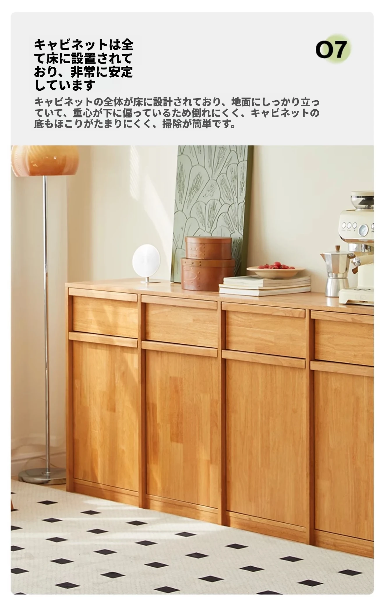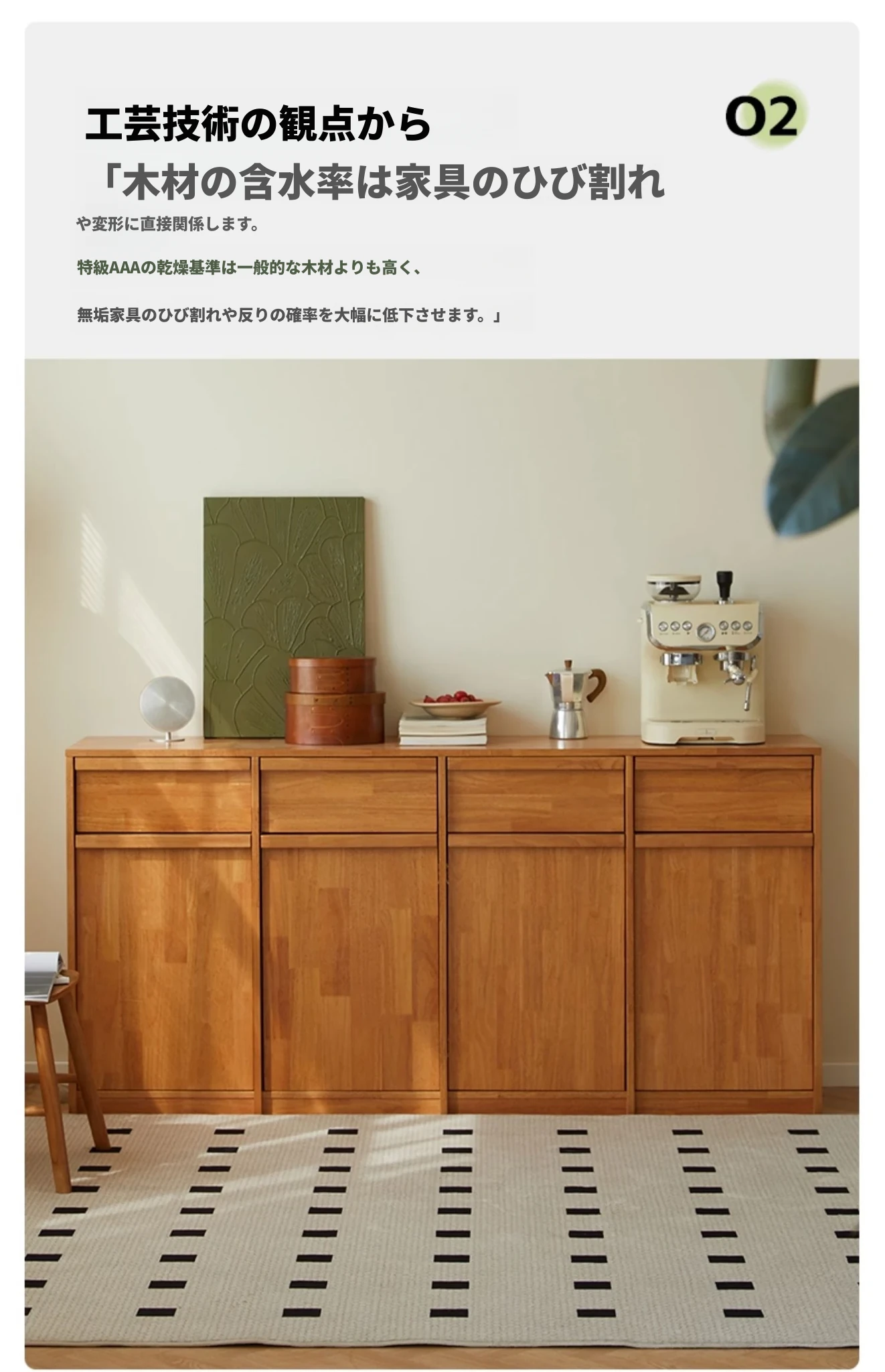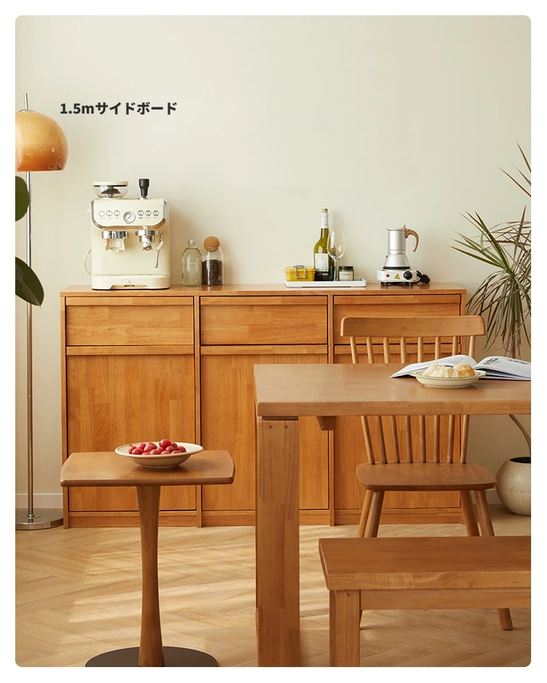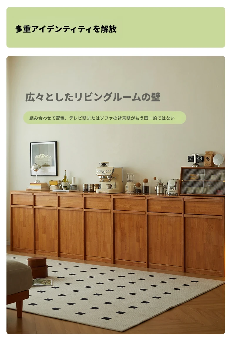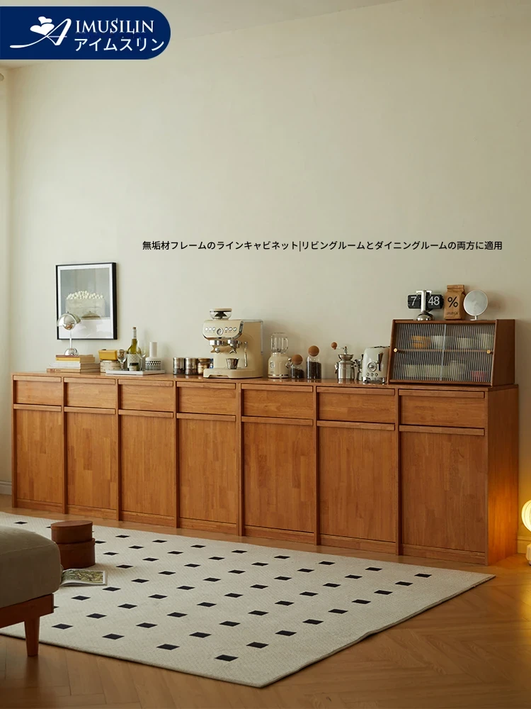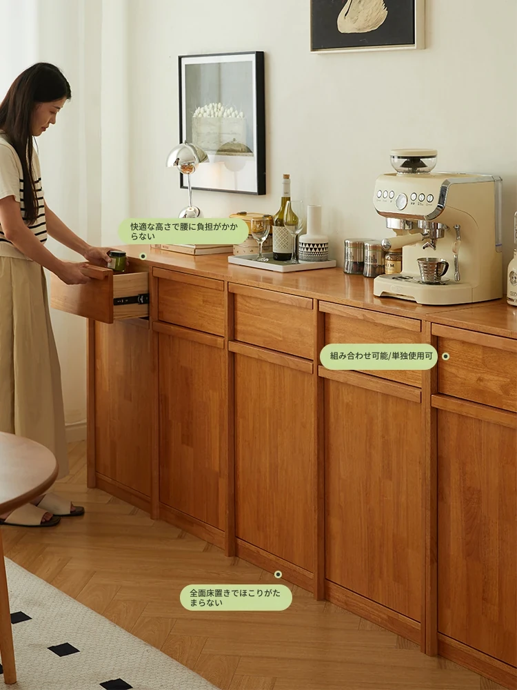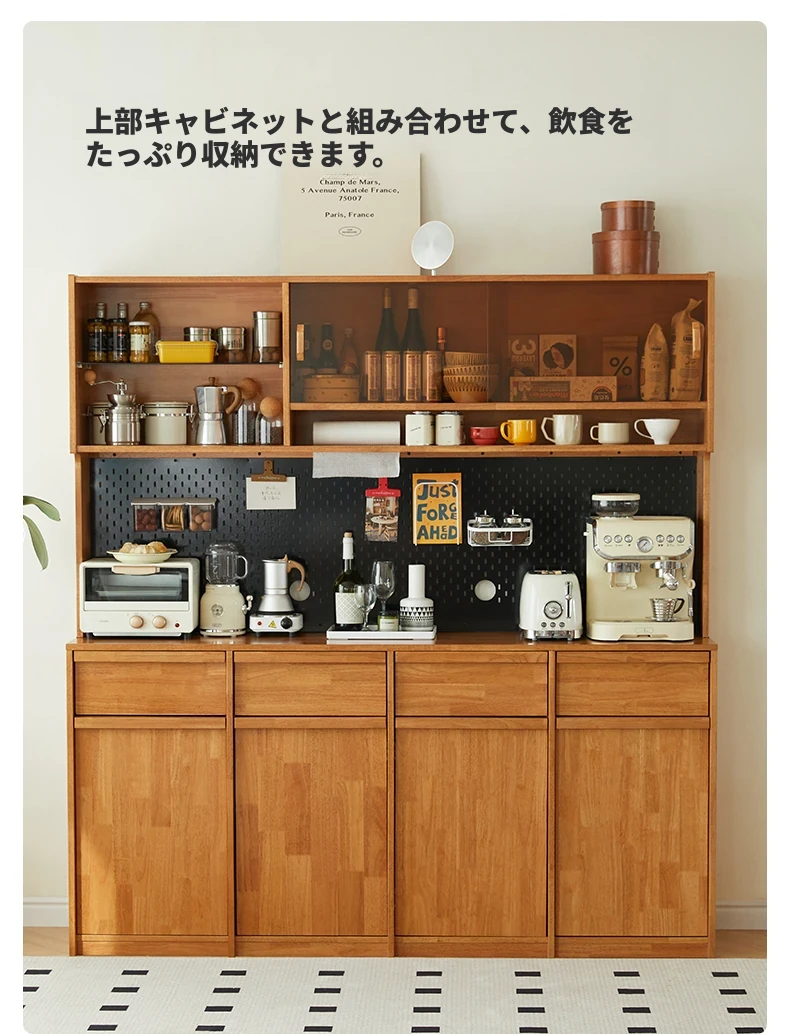 ウォールキャビネット一体型の無垢材ダイニングサイドボード - キッチンやリビングに最適なシンプルでスタイリッシュな収納キャビネット。お茶や食器の整理にぴったりな低めのデザインで、空間を有効活用!