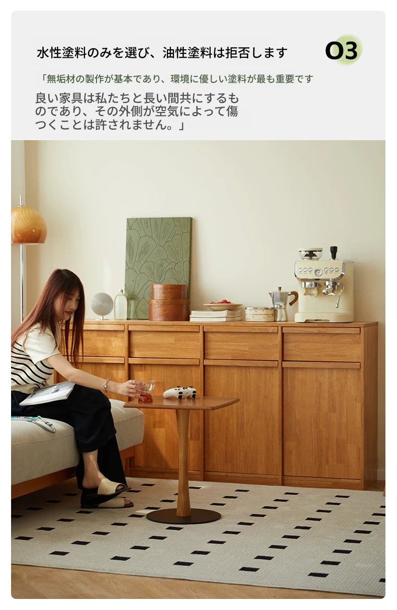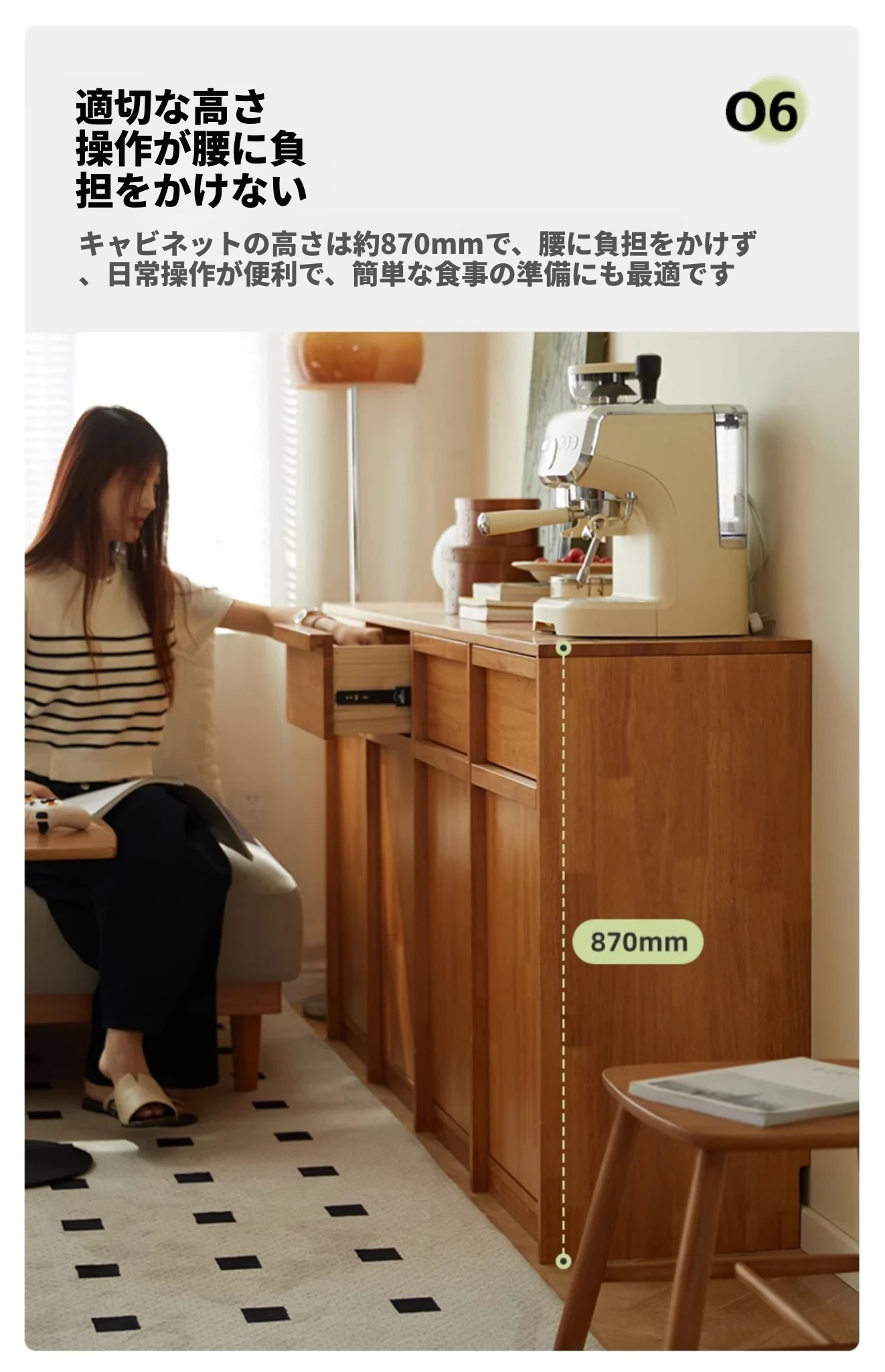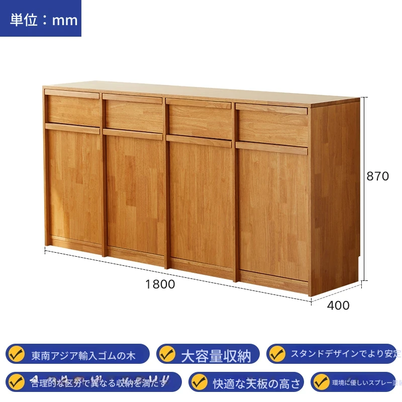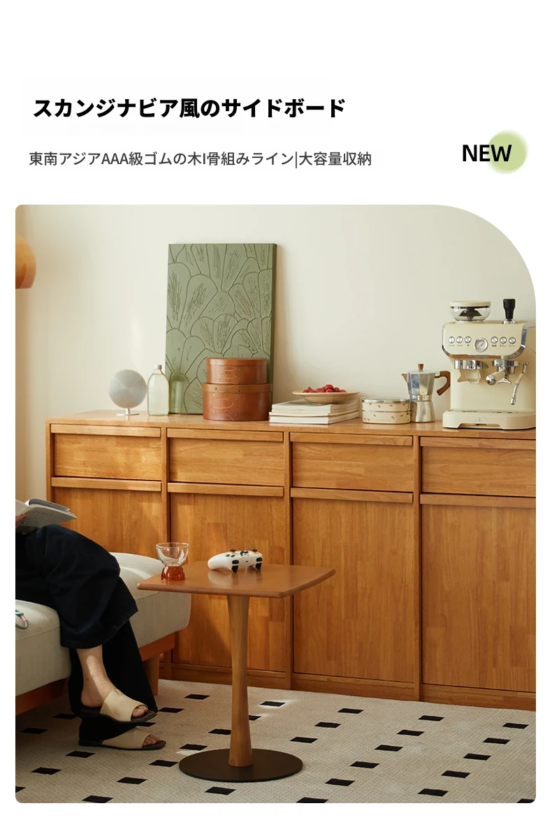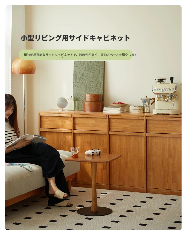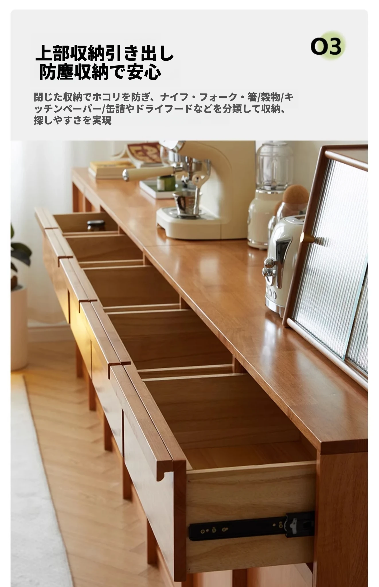 ウォールキャビネット一体型の無垢材ダイニングサイドボード - キッチンやリビングに最適なシンプルでスタイリッシュな収納キャビネット。お茶や食器の整理にぴったりな低めのデザインで、空間を有効活用!