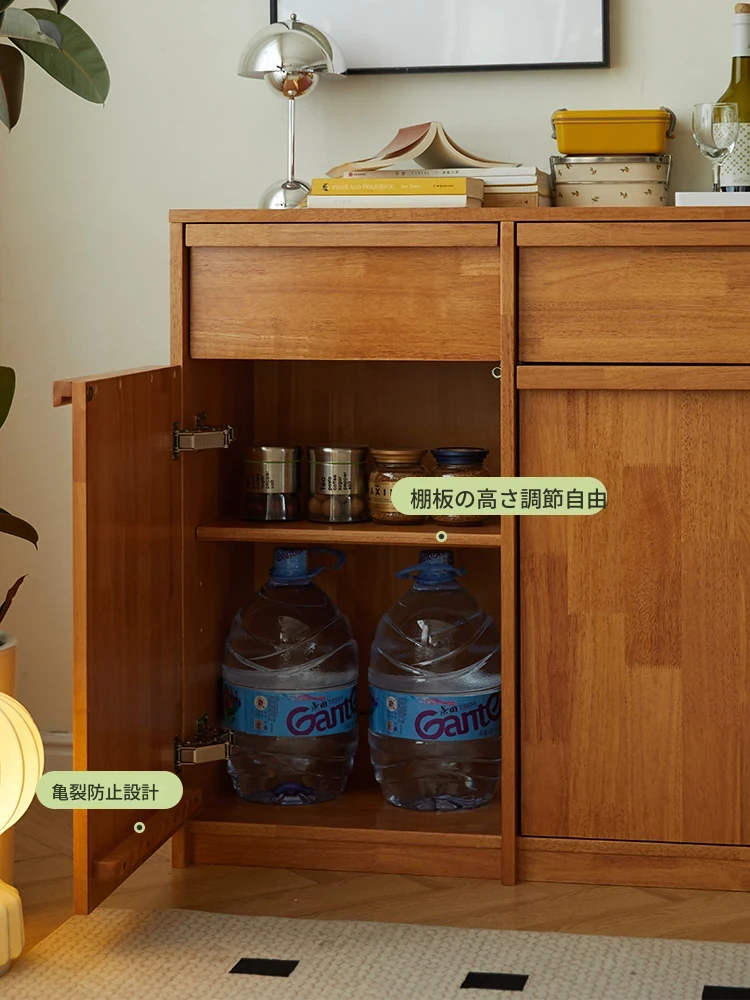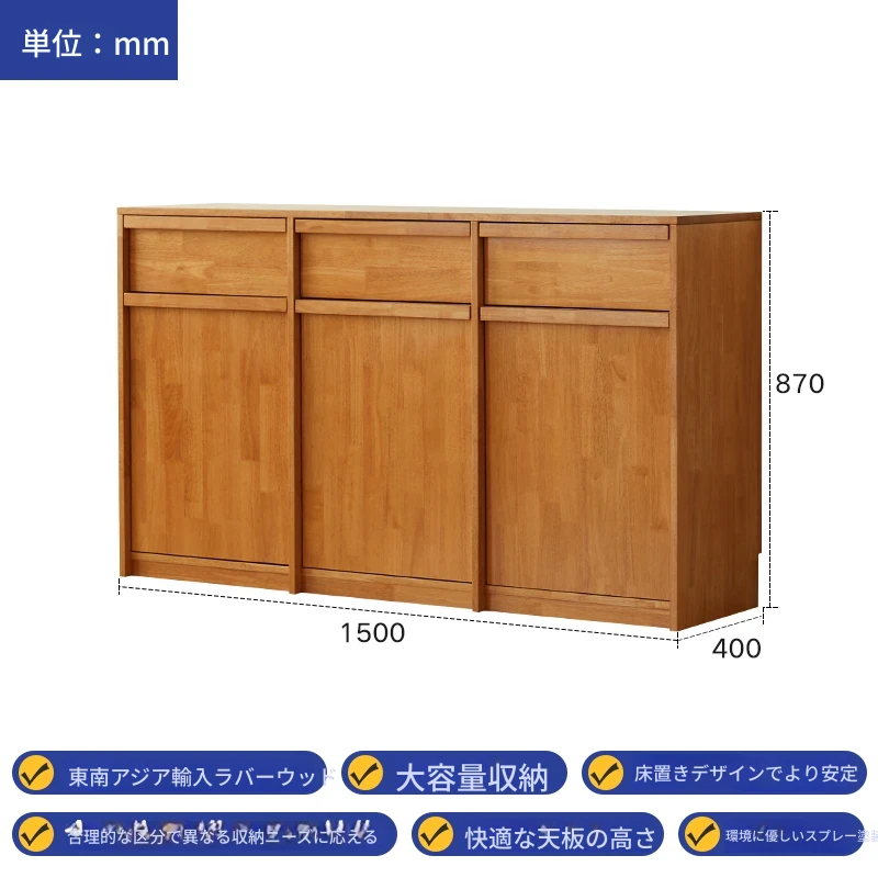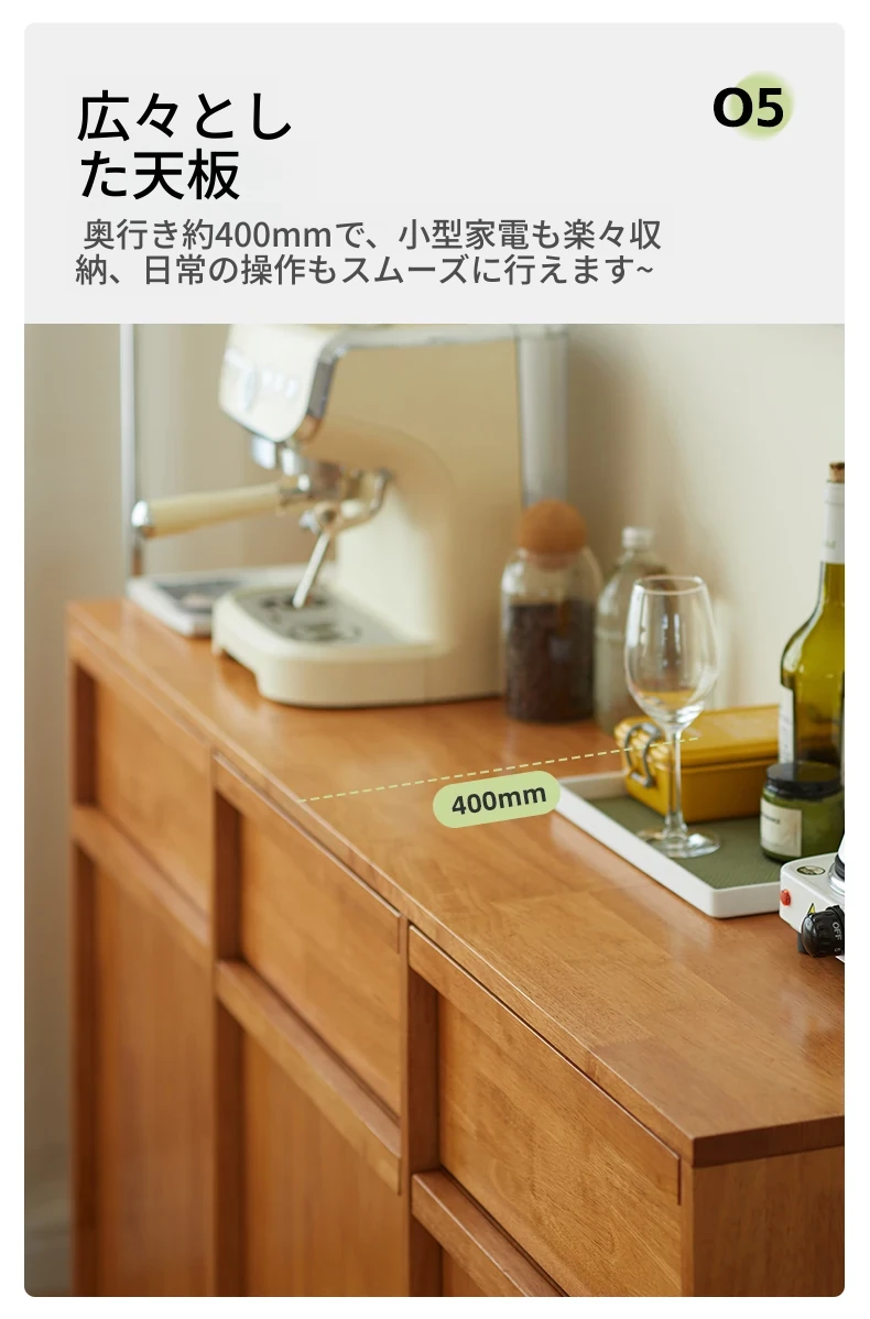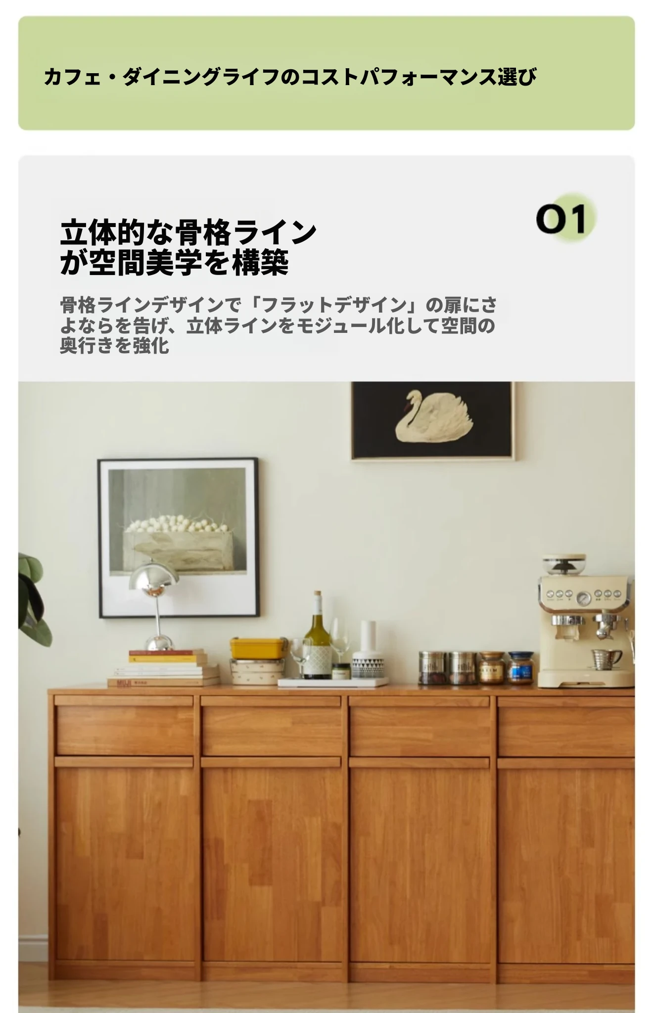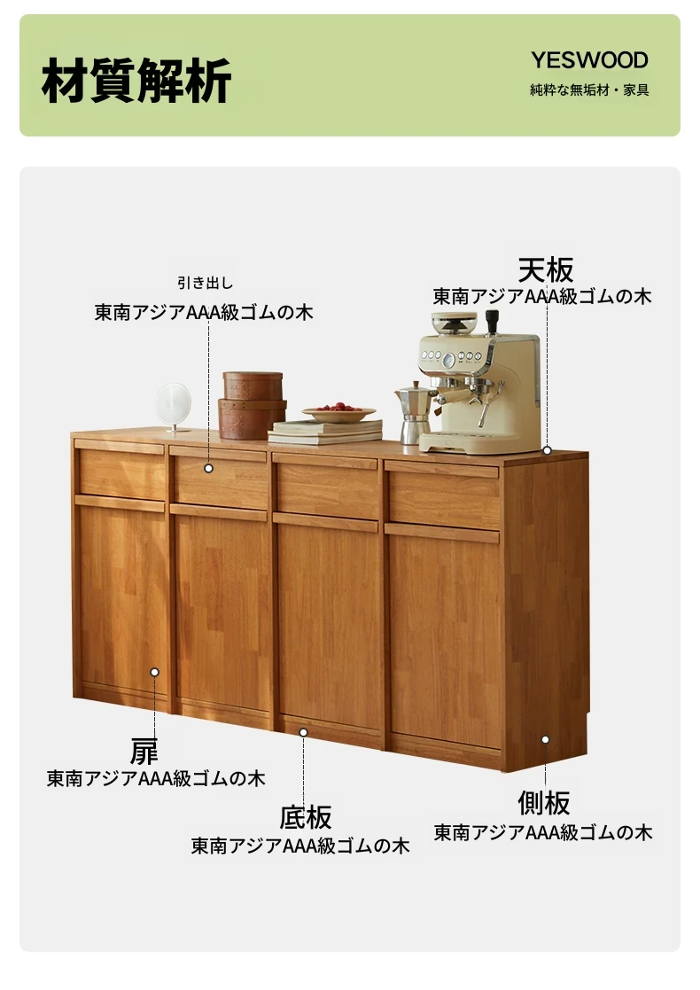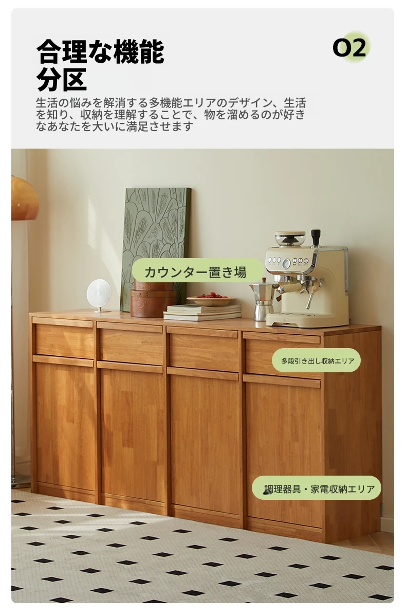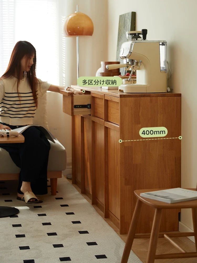 ウォールキャビネット一体型の無垢材ダイニングサイドボード - キッチンやリビングに最適なシンプルでスタイリッシュな収納キャビネット。お茶や食器の整理にぴったりな低めのデザインで、空間を有効活用!