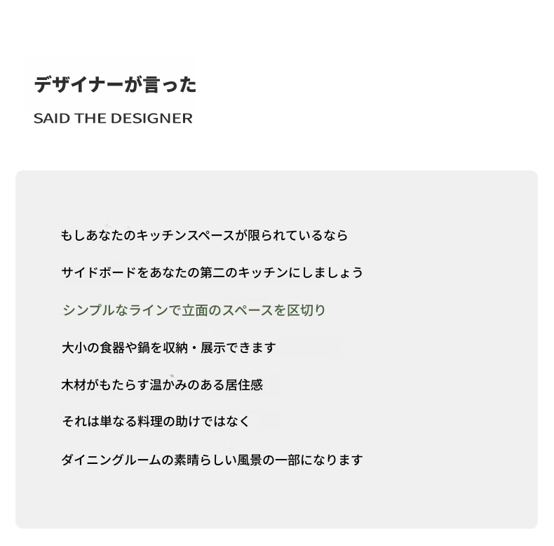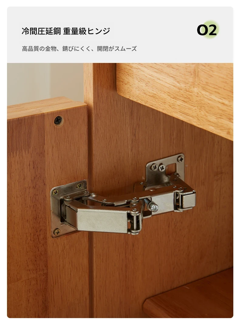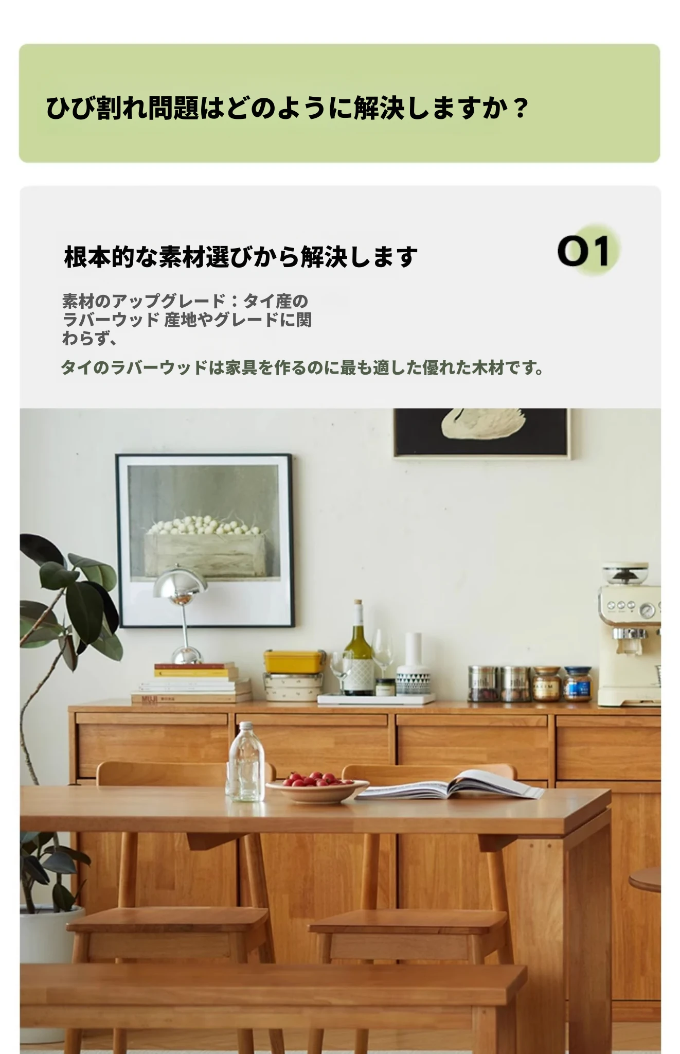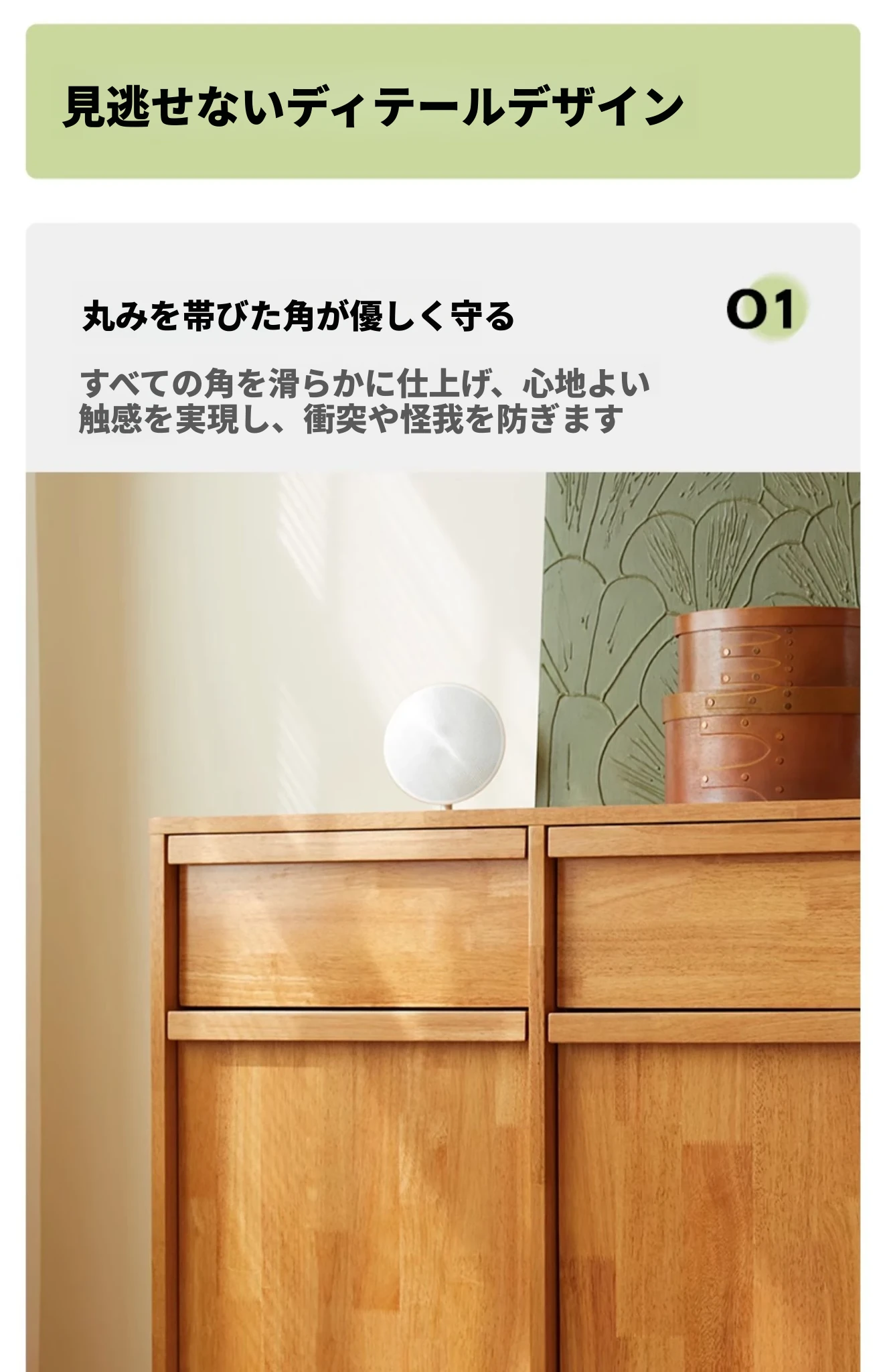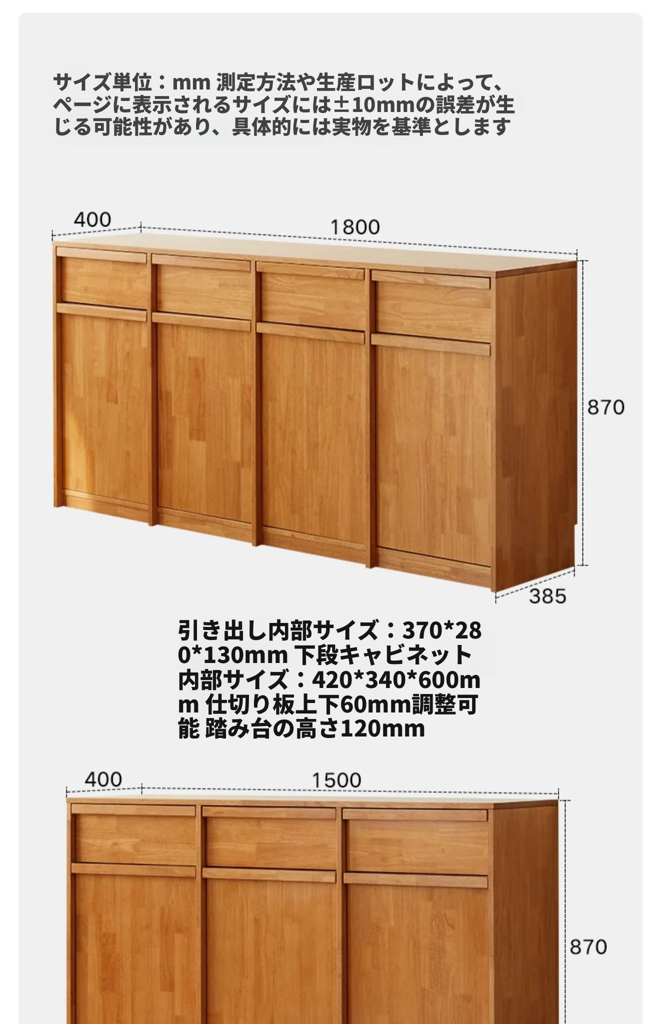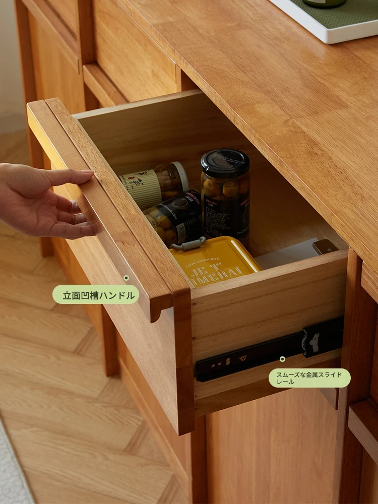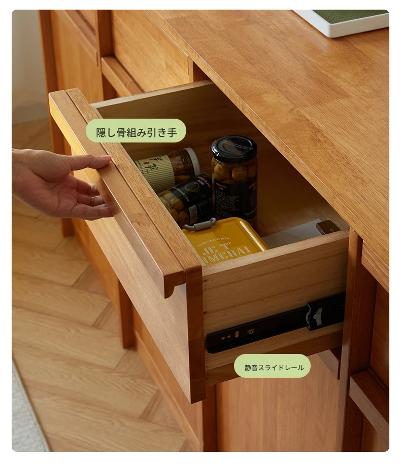 ウォールキャビネット一体型の無垢材ダイニングサイドボード - キッチンやリビングに最適なシンプルでスタイリッシュな収納キャビネット。お茶や食器の整理にぴったりな低めのデザインで、空間を有効活用!