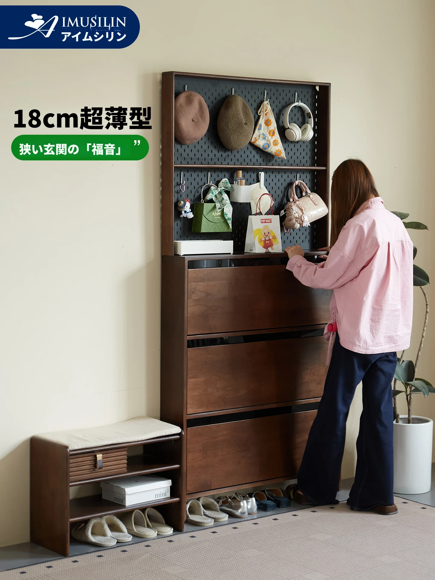 超薄18cm実木シューズキャビネット - 家庭用玄関収納ラック!衣帽掛け一体型、中古感満載のスタイリッシュなデザインで、スッキリした玄関を実現します。限られたスペースでも大容量収納可能!