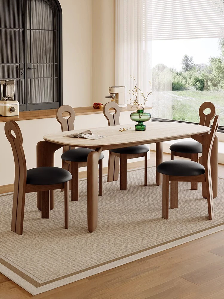 安居坊の侘寂スタイルのアンティーク風洞石岩板実木ダイニングテーブル&チェアセット - 高級フレンチデザイン、小型住宅にぴったりのエレガントな食卓!
