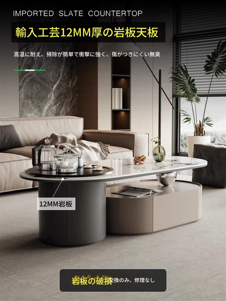 イタリアンシンプルデザインのロックプレートコーヒーテーブル - 小さなリビングに最適!昇降機能付きで収納も充実。多機能なテーブルで、家族や友人との楽しいひとときを演出します。