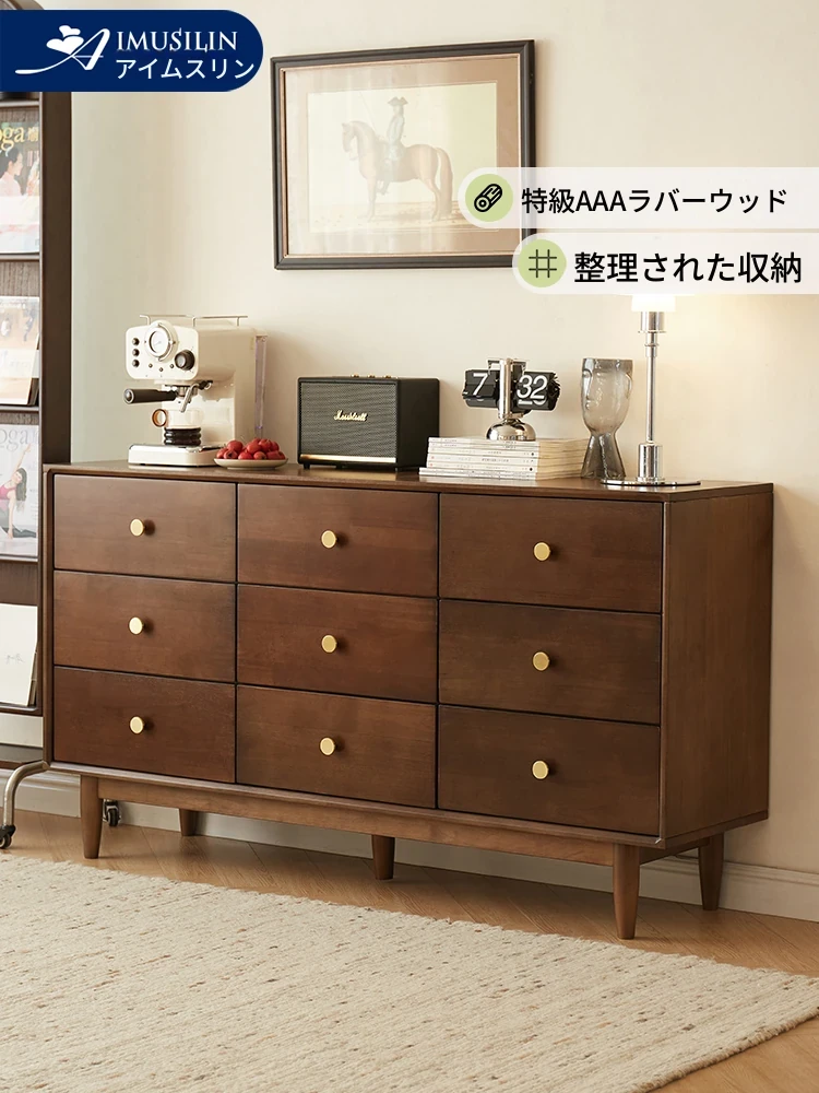 全実木製の引き出しキャビネット - 寝室のベッドサイド収納に最適な9段のシンプルな和風クルミ色キャビネット。スタイリッシュで機能的、リビングルームの収納にもぴったり!