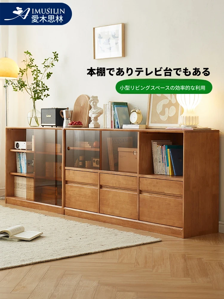 ガラス扉付きの低い本棚、天然木製のフロアタイプ収納キャビネット。リビングやダイニングに最適!スタイリッシュな和風デザインで、収納力抜群。テレビボードとしても活躍する多機能家具です。