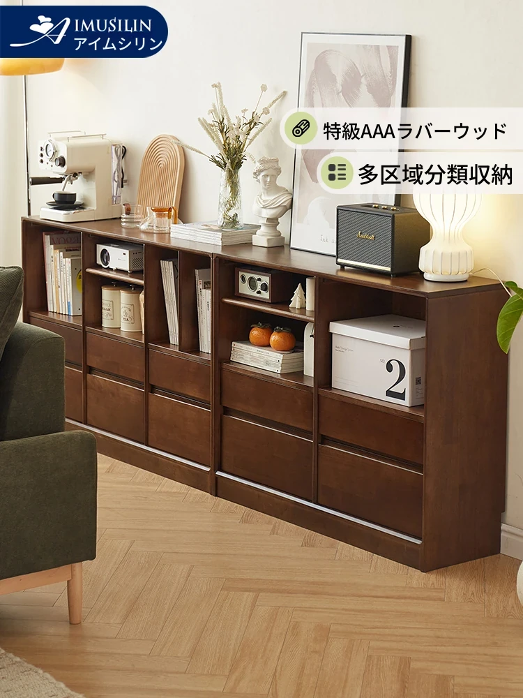 天然木材使用のスタイリッシュな本棚!低めのデザインで、リビングやダイニングにぴったり。収納力抜群のグリッドシェルフ、テレビボードとしても最適。シンプルながら温かみのある日本風収納家具です。
